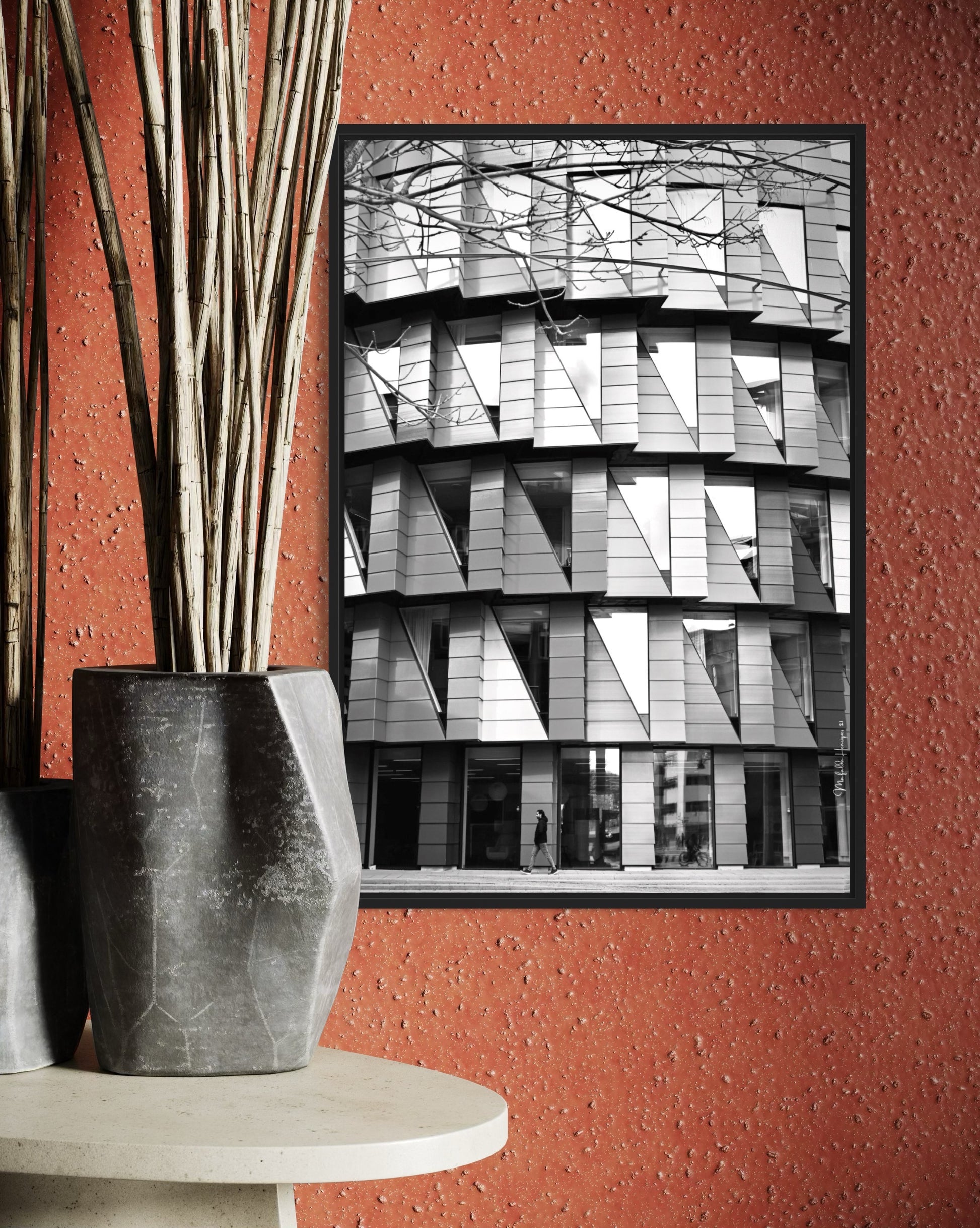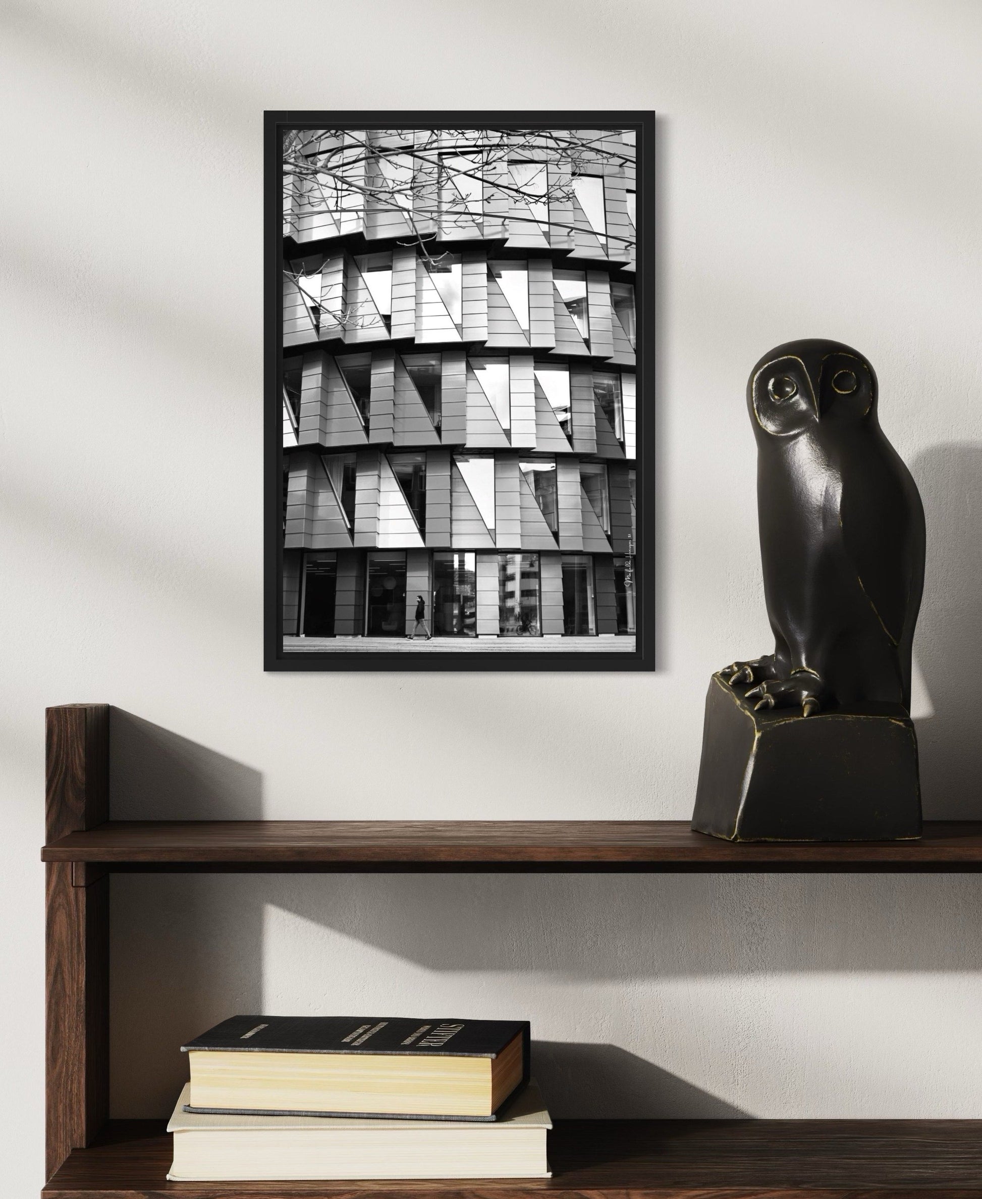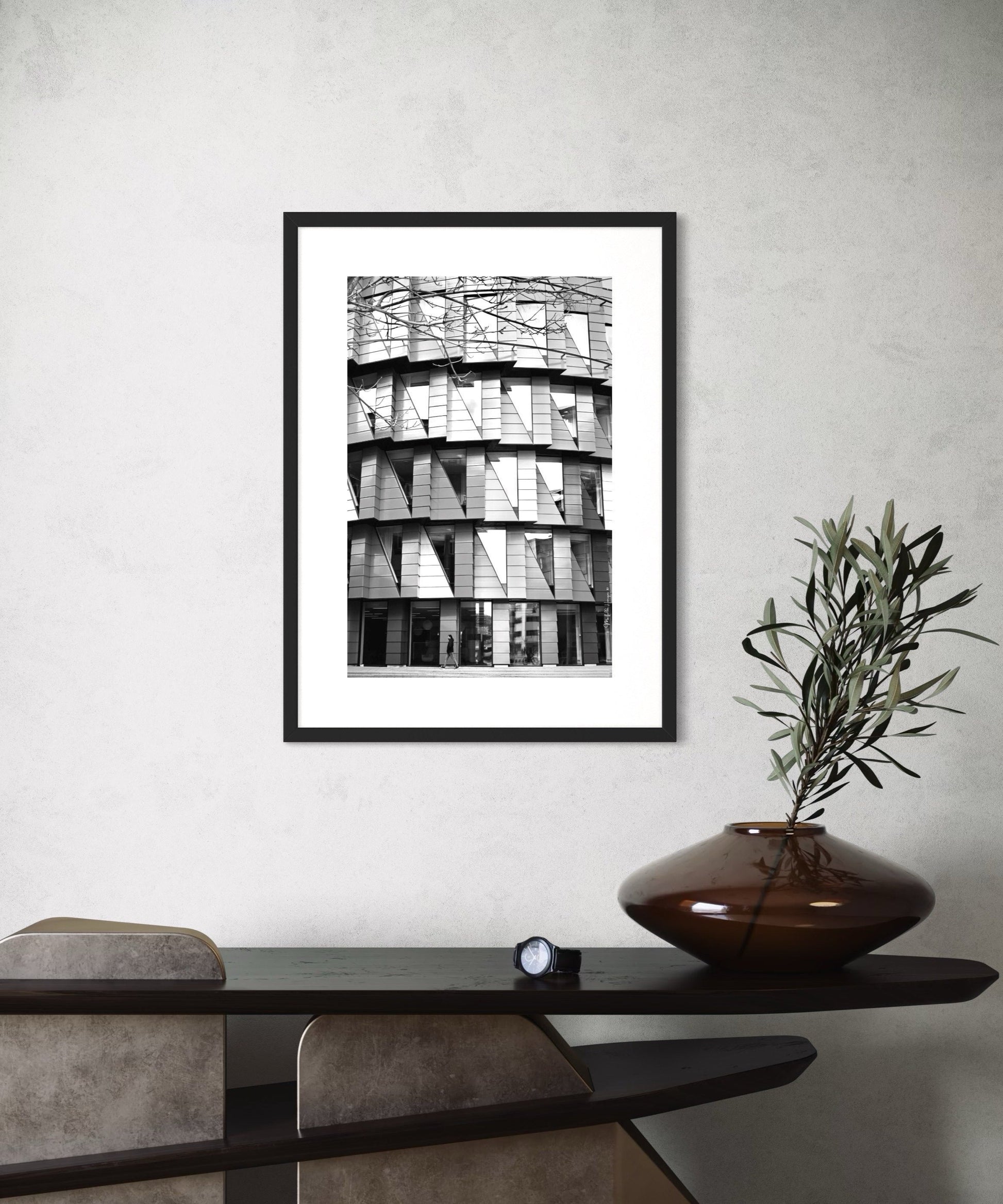 This moment of encounter between the individual and the urban space, captured in a black-and-white palette, evokes a reflection on the contrast between permanence and transience, between the strength of concrete and the ephemerality of everyday life.
