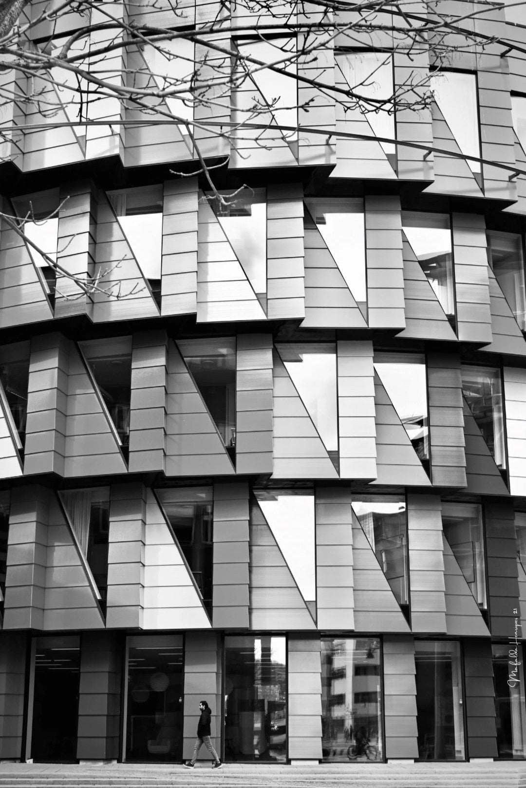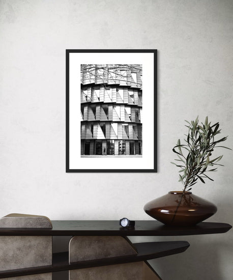 In this black-and-white photograph, a man walks alone beside a building with modern and striking architecture. The round structure, with bold and imposing lines, emerges with a silent, almost timeless strength, while the soft contrast between light and dark intensifies the drama of the scene. The building, situated near the riverbank, reflects the intersection of the city’s concrete and the water’s fluidity, creating an atmosphere of serenity and contemplation.