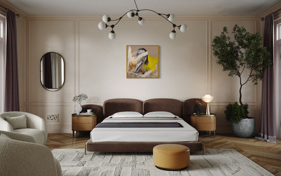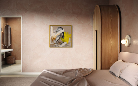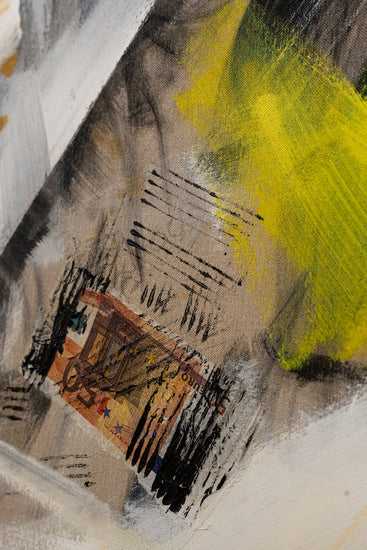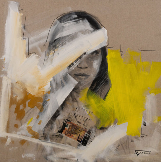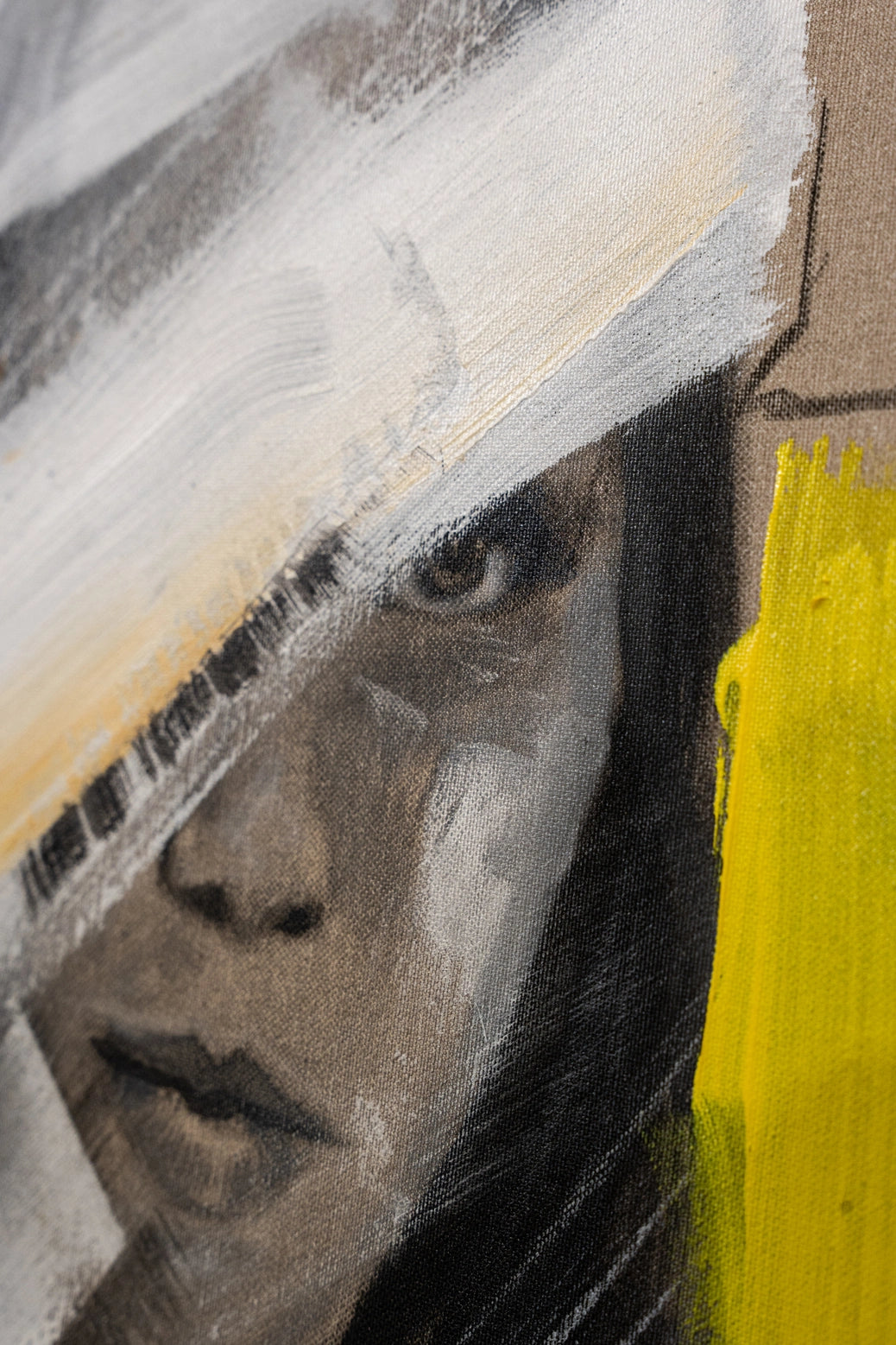 This painting presents a striking portrait partially obscured by dynamic strokes of white, yellow, and beige. The woman's face, rendered in monochrome, emerges from the abstract background, creating a sense of mystery and intrigue. The bold, expressive brushstrokes convey a feeling of movement and depth, blending figurative and abstract elements seamlessly.