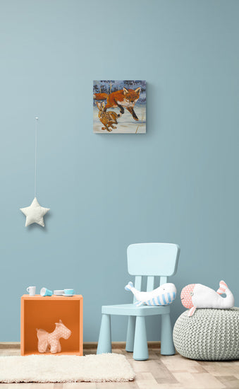 "The Hunter's Gaze" captures a dramatic moment in the wild as a fox leaps towards a hare on a wintry day. The painting's vivid, thick brushstrokes emphasize the movement and raw energy of the chase. The fox, rendered in bright orange against the cool blues and whites of the background, highlights its focus and determination. This artwork beautifully balances the tension of the hunt with the serene, frosty landscape, offering a snapshot of nature's stark realities.