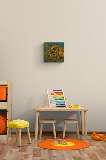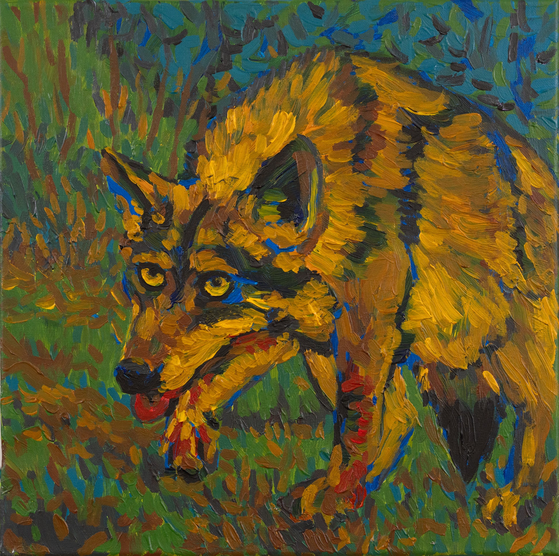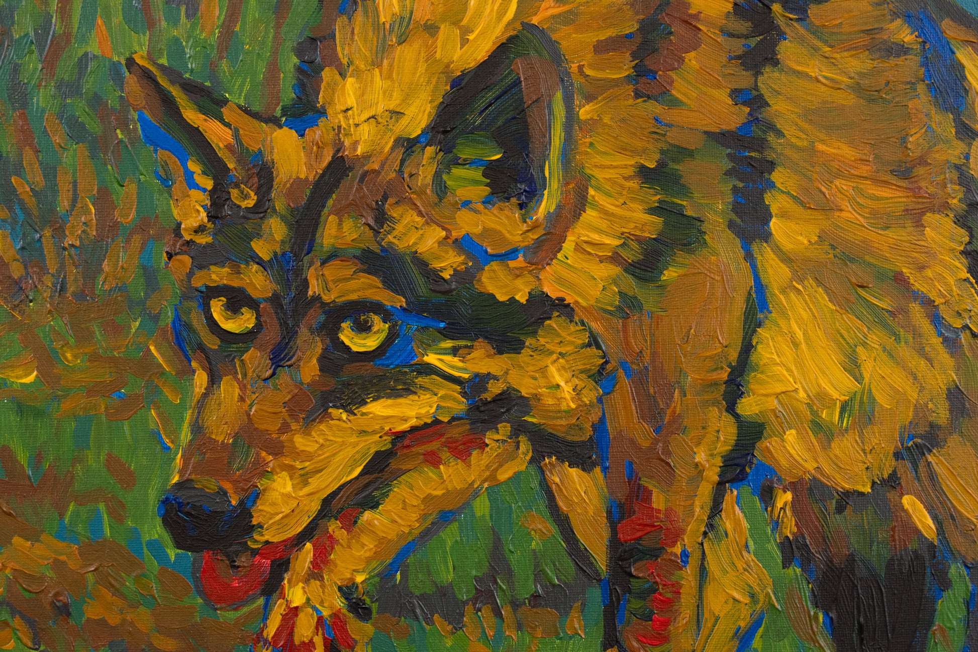 This compelling portrayal of a wolf captures a moment of rest amidst a hunt, with the predator's eyes locked onto its unseen prey. The rich, textured brushstrokes and vibrant colors bring the scene to life, emphasizing the intensity and focus of the wolf. The abstract background, with its blend of greens and yellows, creates a dynamic contrast that accentuates the natural camouflage and the raw presence of the wolf.