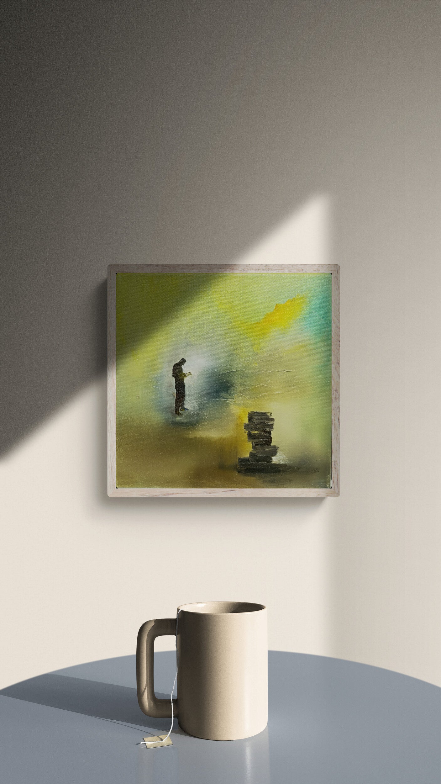 The silhouette stands out against the misty atmosphere, evoking a sense of quiet exploration and personal journey through knowledge. The stack of books beside the figure adds a symbolic element, emphasizing the pursuit of learning and introspection. Perfect for study areas or personal spaces, this piece brings a thoughtful and serene ambiance.