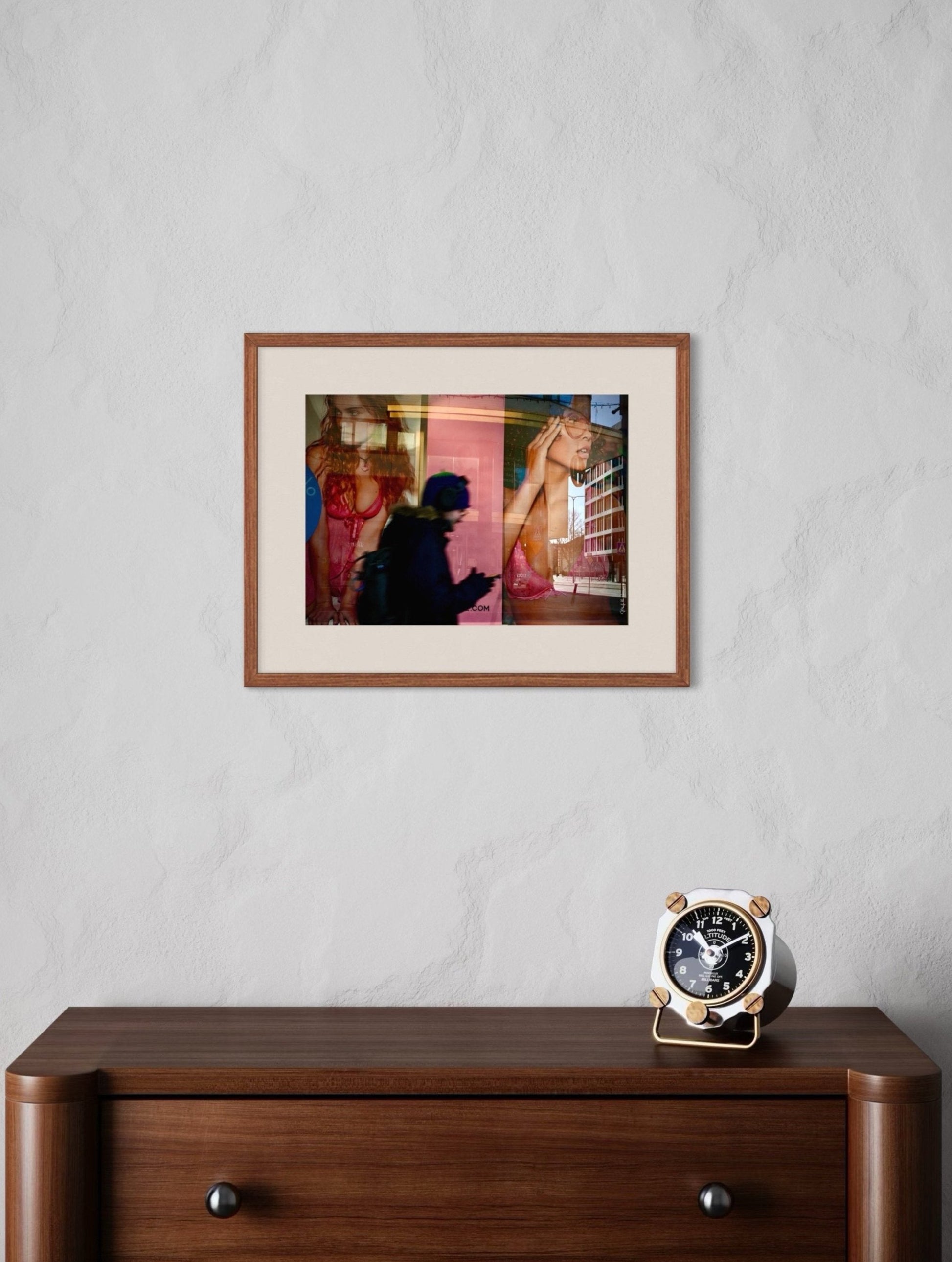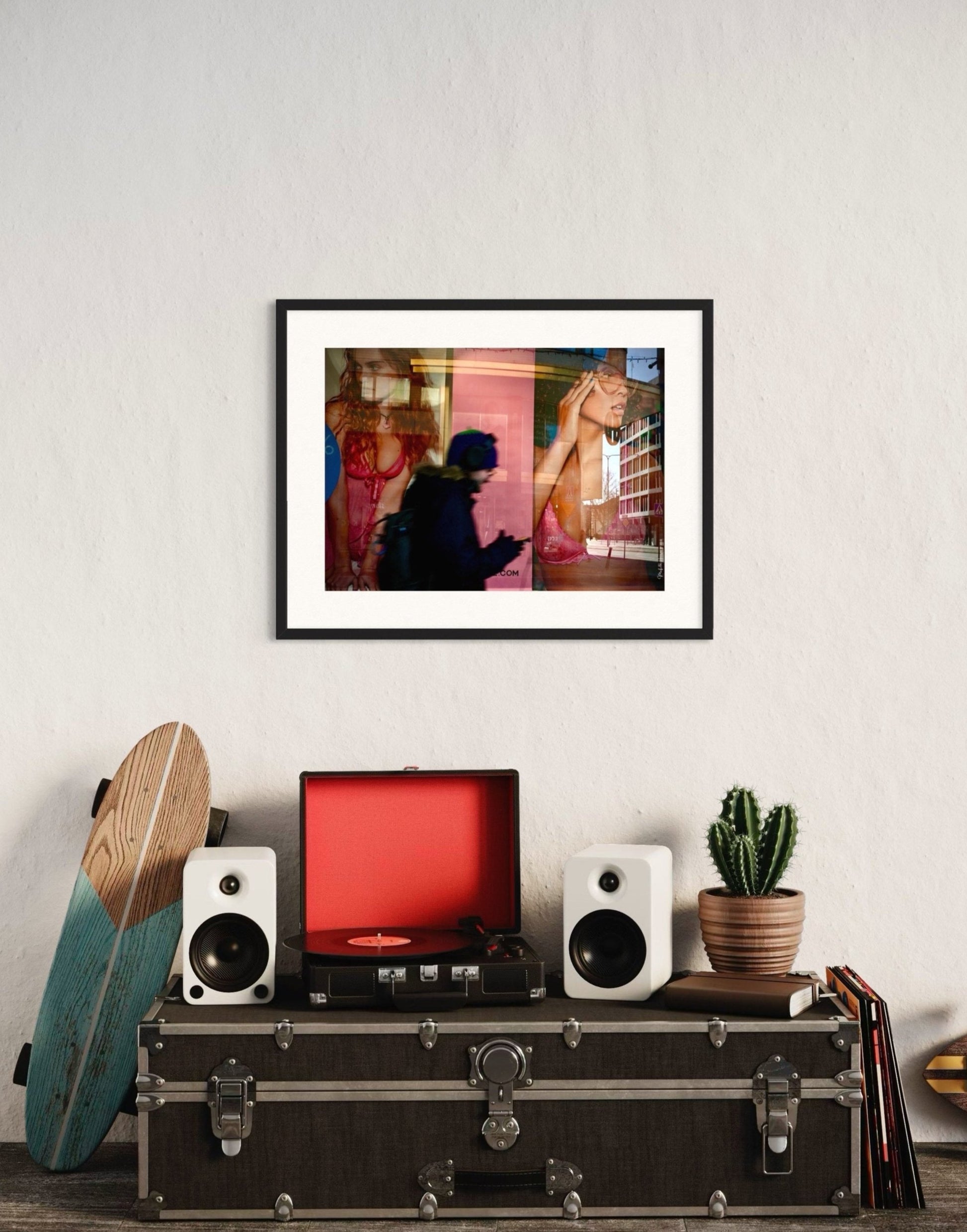 In this vibrant and contrasting image, a colorful storefront displays two photos of young people in lingerie, capturing attention with their confidence and sensuality. The pink tones and careful composition of the window seem to invite the viewer into a world of carefully crafted aesthetics and desire. In the foreground, blurred and less distinct, the shadow of a man crossing the street while focused on his phone appears. He is an anonymous passerby, a mere dark figure that contrasts with the vividness of the storefront.