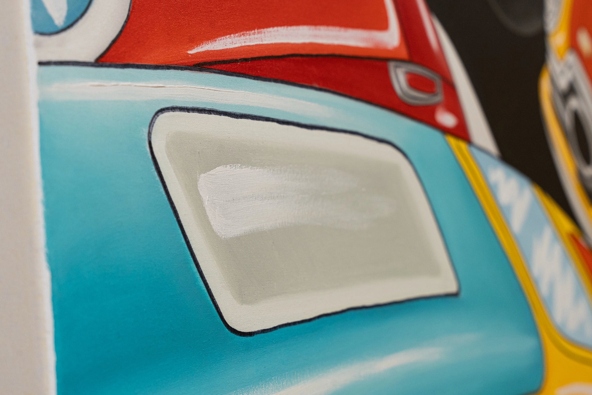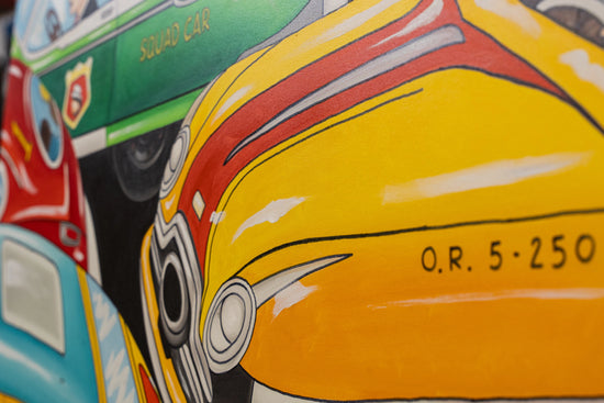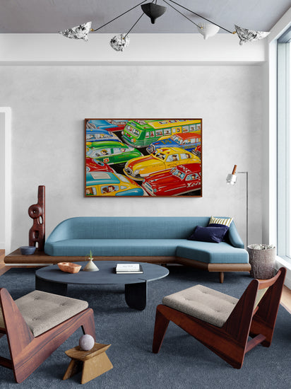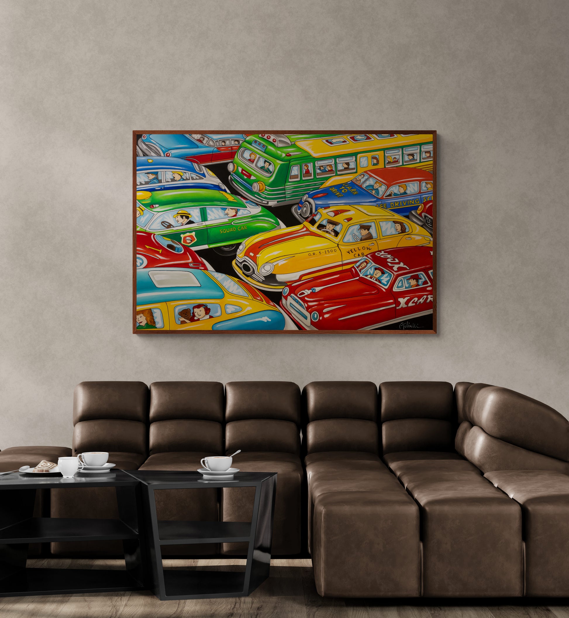 The painting displays a vibrant and colorful painting featuring a busy scene of classic cars and taxis. The style of this painting is reminiscent of pop art, characterized by its bold colors, vivid depiction, and playful take on commercial and popular culture imagery. The use of exaggerated colors and the focus on a bustling urban environment enhance its connection to the pop art movement, which often embraces popular and mass culture themes, making art accessible to a wider audience.