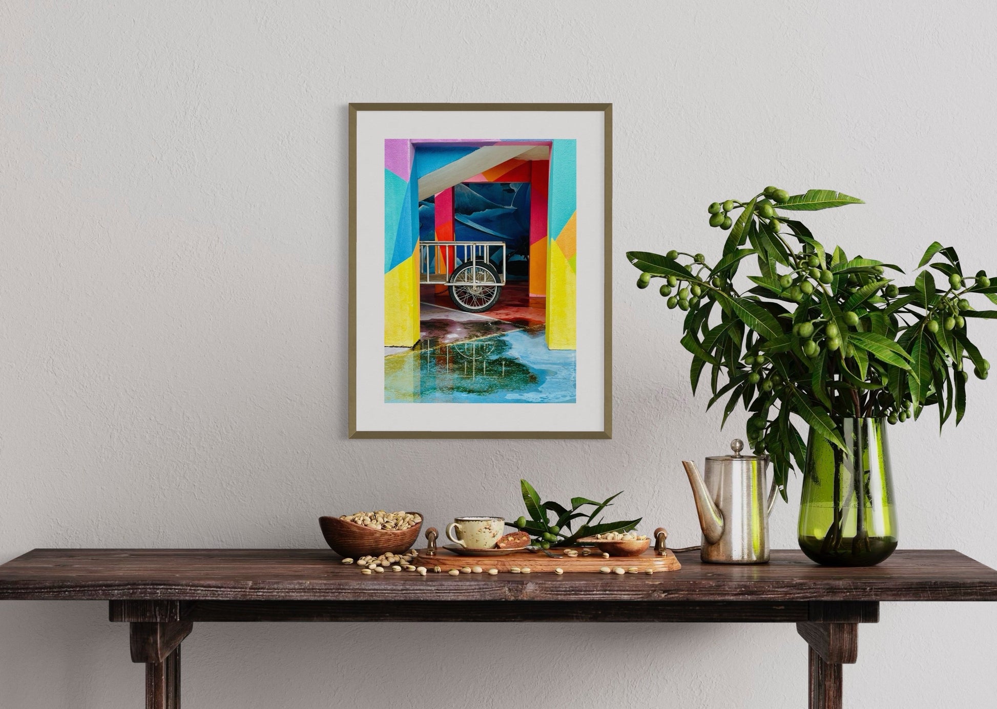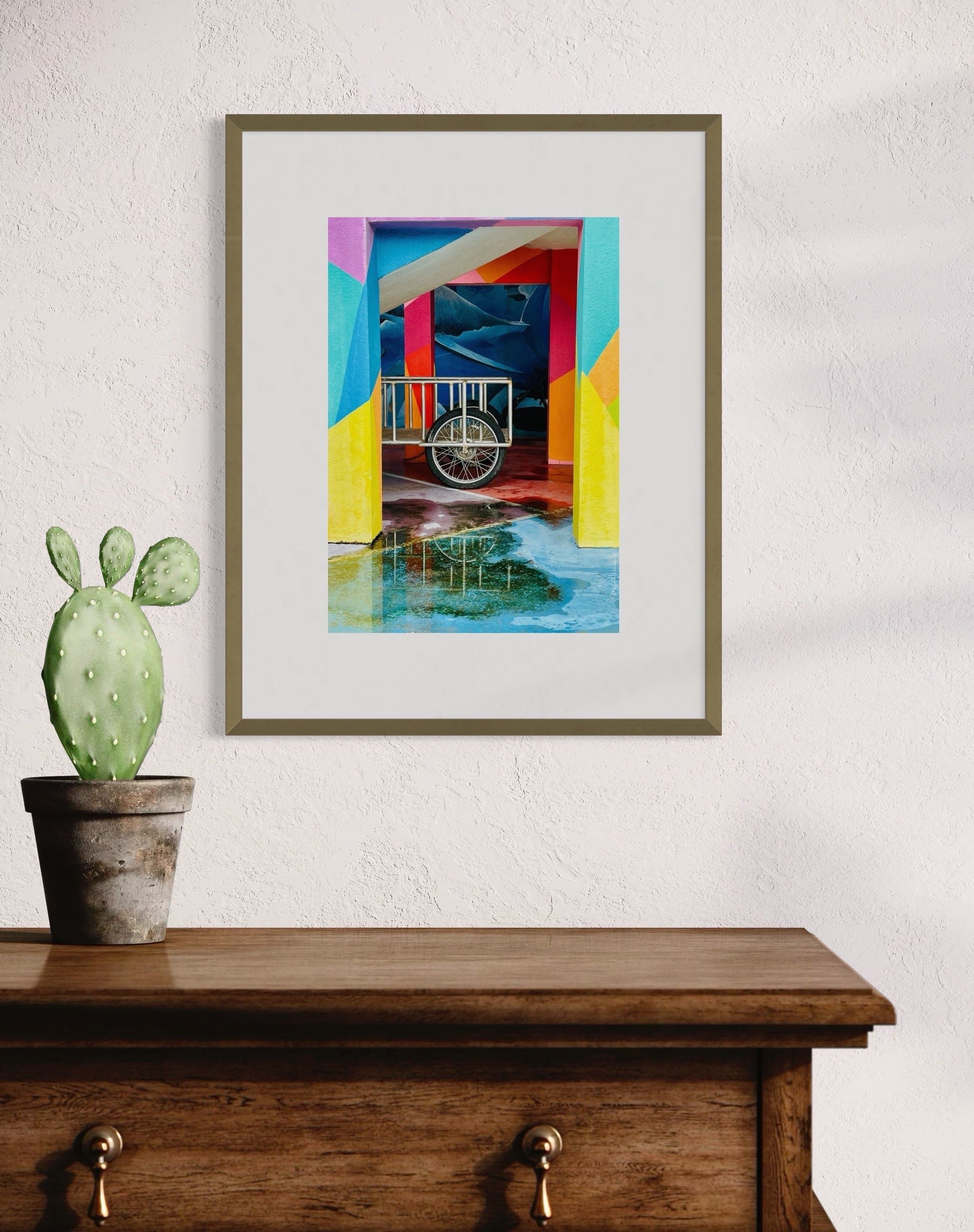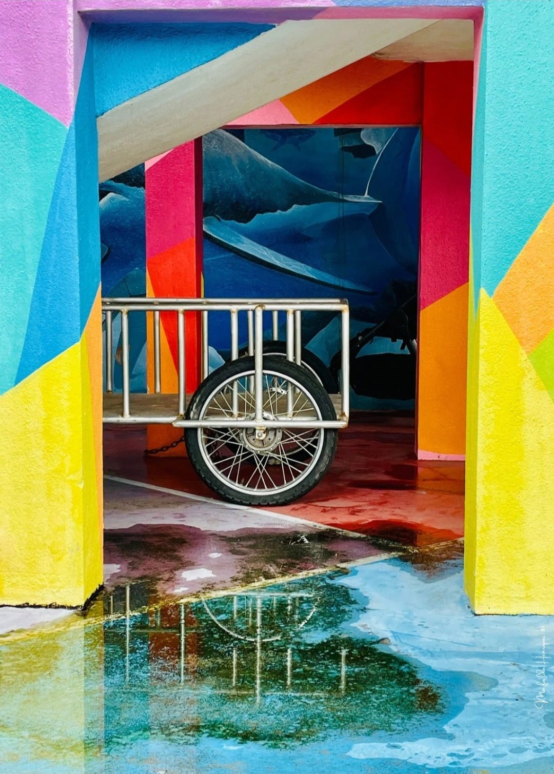Under the colorful arcade, a motorcycle trailer rests, its image unfolding in a puddle of water that glimmers gently outside. The puddle, like an unexpected mirror, captures the essence of this vehicle of travel and adventure, duplicating it with an enigmatic calm. This reflection becomes a second view, an almost ethereal dimension where the real and the reflected coexist, suggesting parallel stories and journeys yet to be discovered.