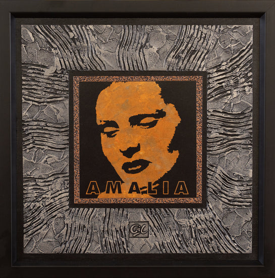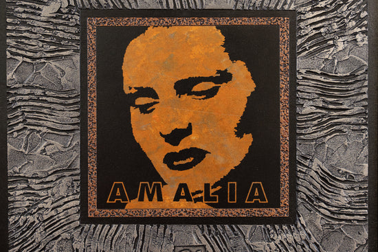 This portrait of Amália Rodrigues, revered as the queen of Fado, encapsulates her deep emotional connection to traditional Portuguese music. The textured, crackled background symbolizes the depth and enduring nature of her impact on Fado, highlighting her intense expression and the emotional power of her performance.