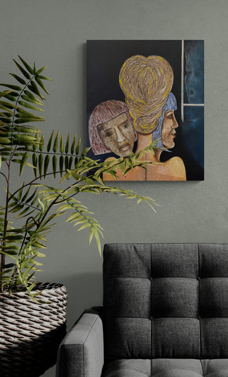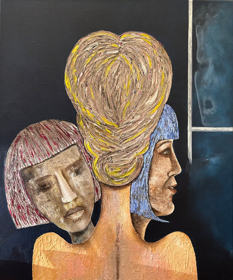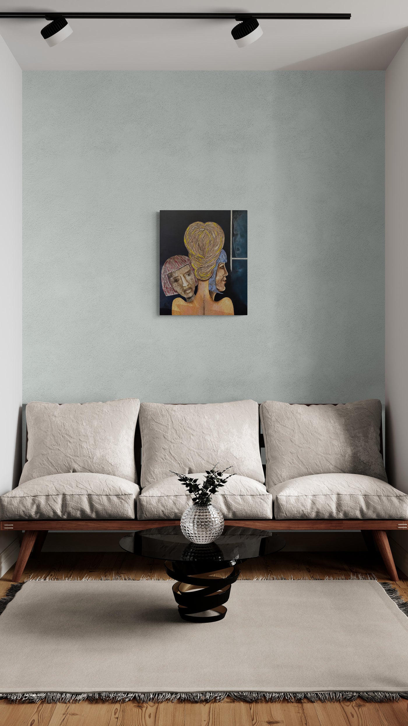 This textured painting features a striking portrayal of two figures, back to back, symbolizing duality, perception, and judgment. The intricate detail in their hair and expressions adds depth and complexity to the piece.