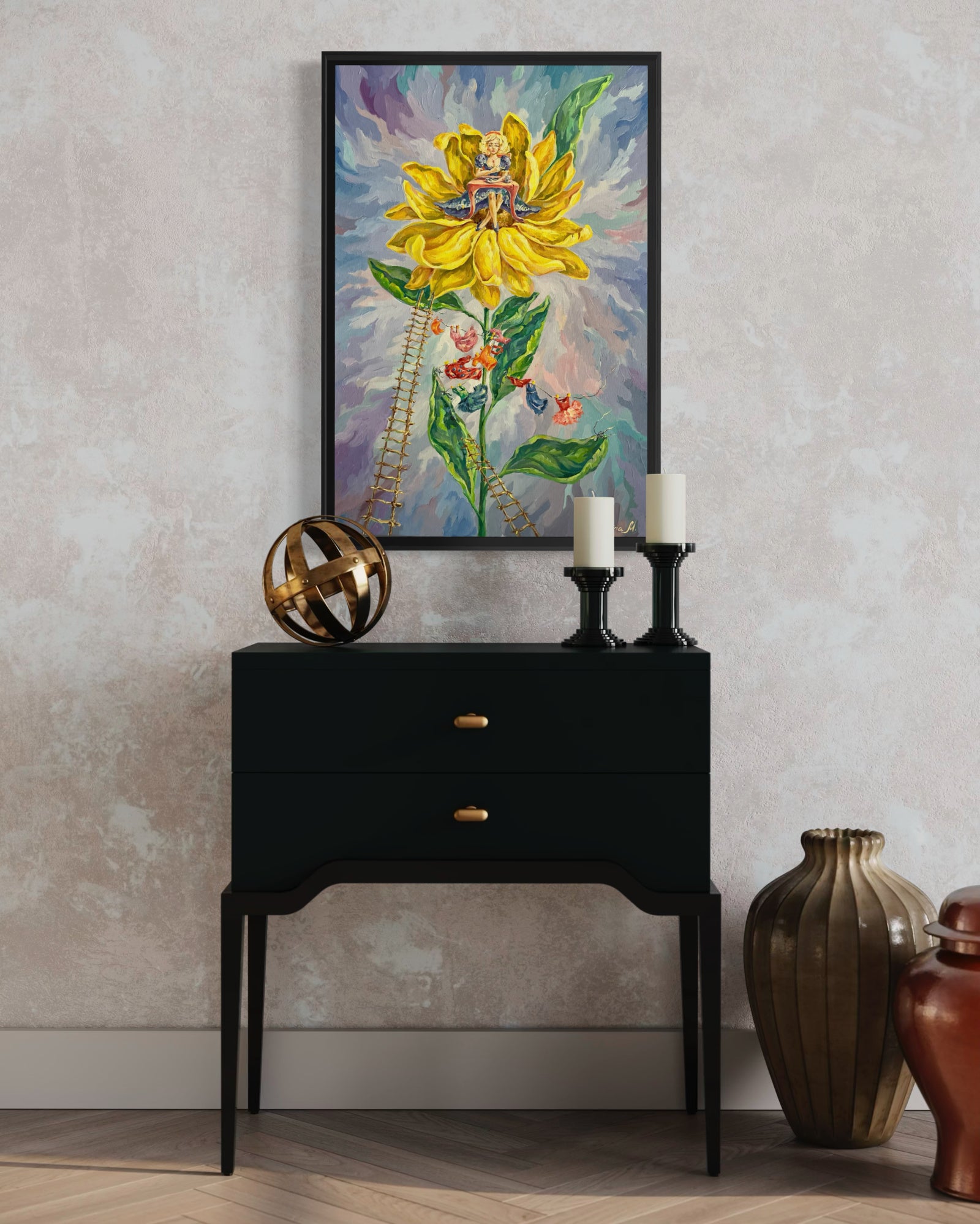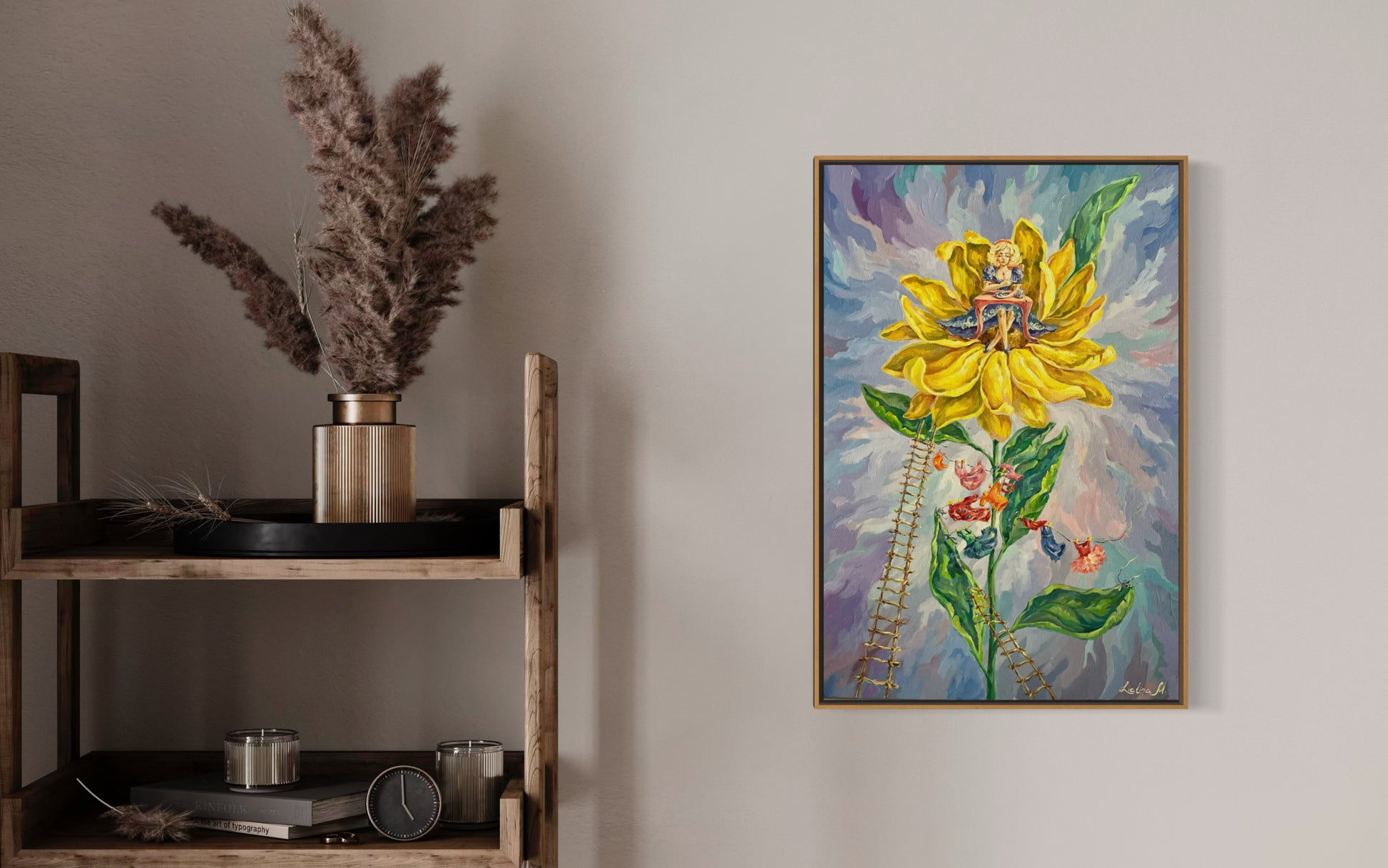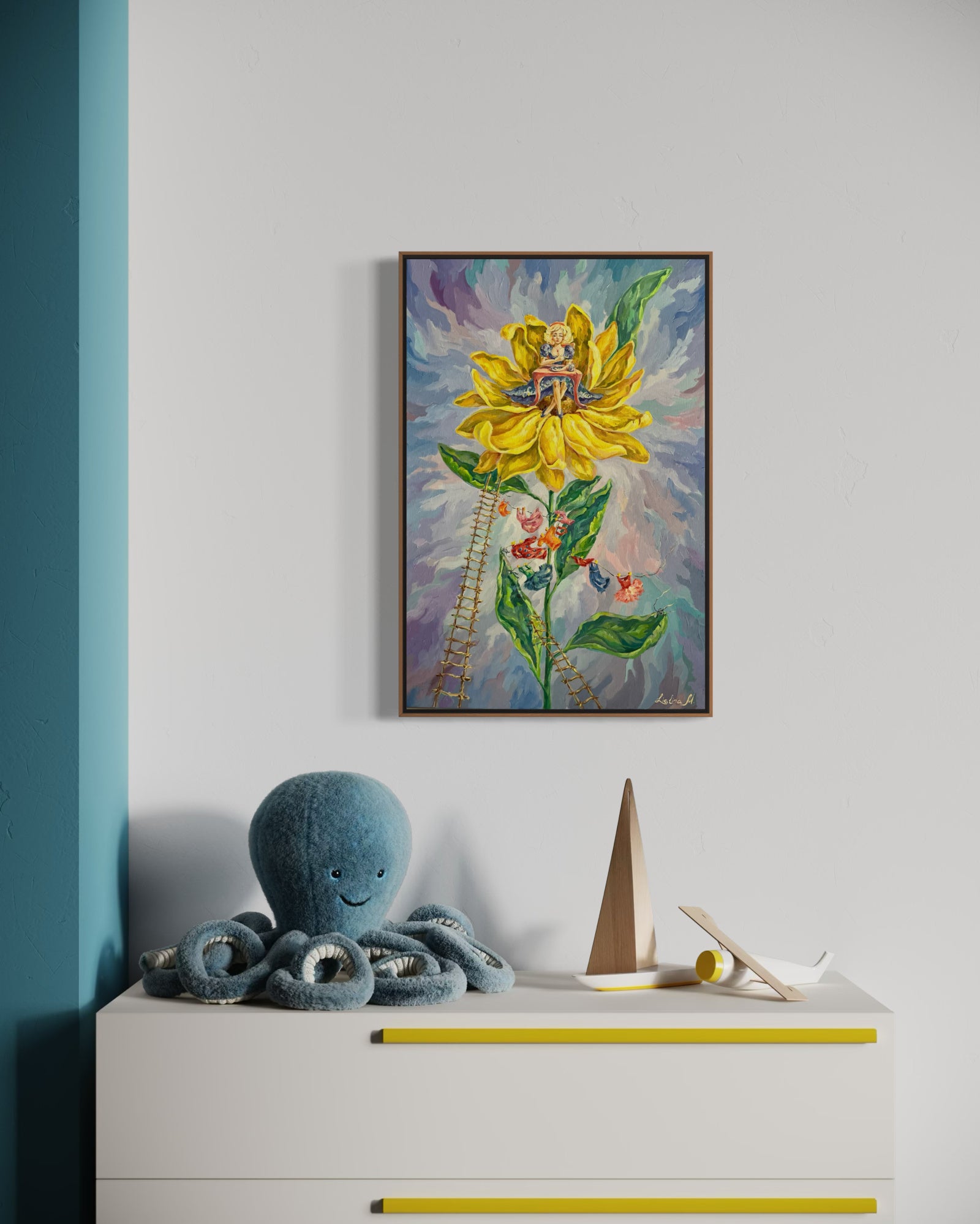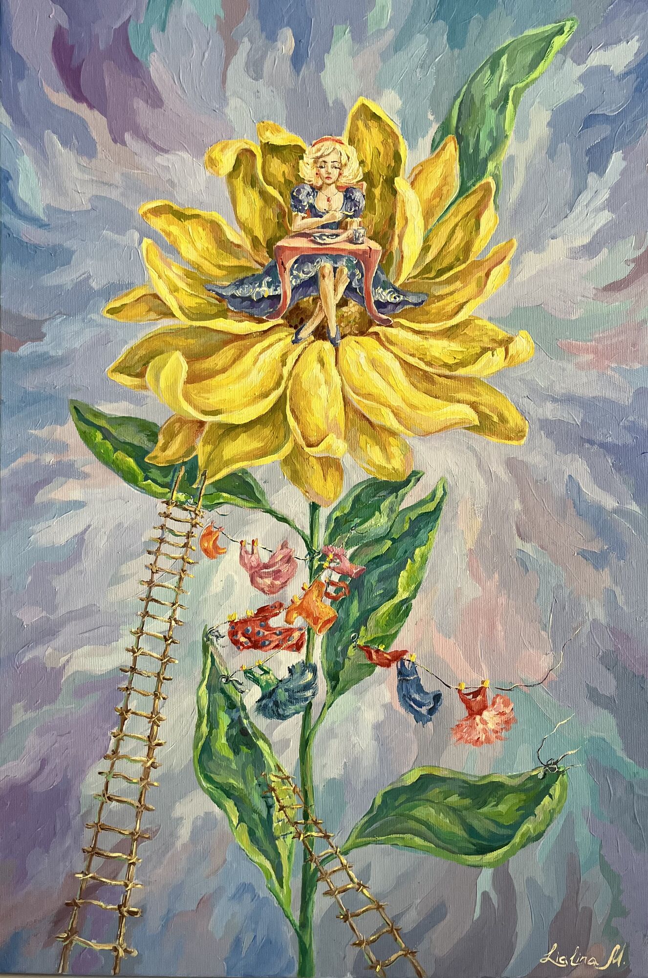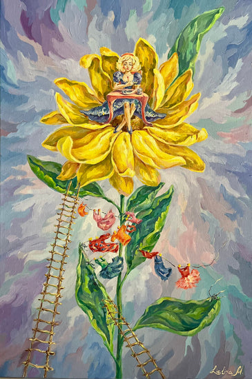 High above the ground, nestled on a blooming yellow flower, Thumbelina enjoys a whimsical breakfast for one — surrounded by floating ladders and wind-blown laundry. A surreal moment of stillness in a dreamlike world of color and imagination.