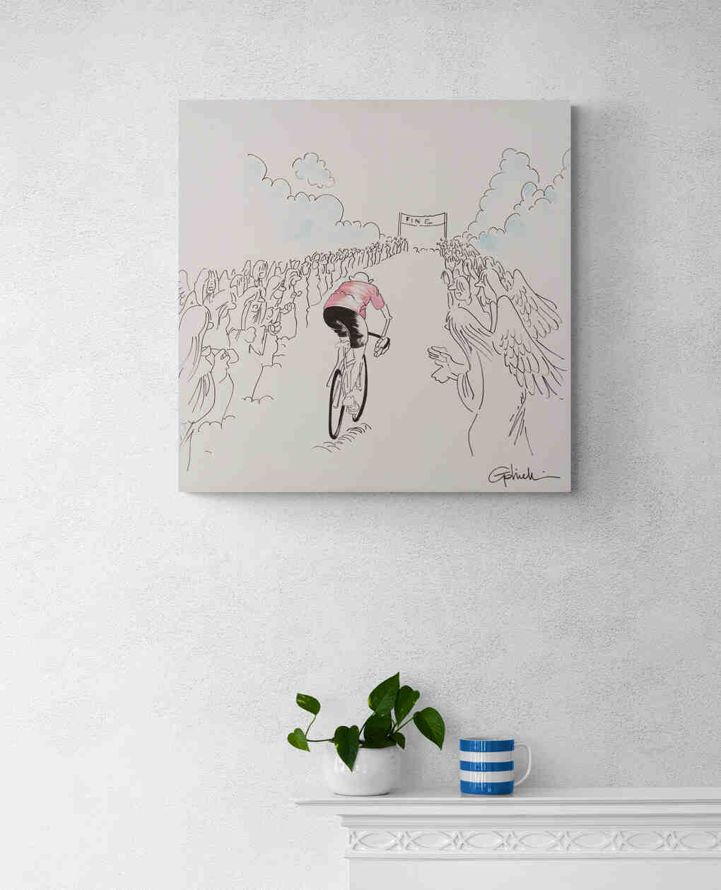 In this evocative ink and watercolor piece, the artist captures the triumphant moment of a cyclist nearing the finish line, surrounded by cheering angels. This ethereal crowd, their wings softly shaded in delicate gray tones, represents perhaps the spirits of past champions or symbolic guardians, applauding the cyclist's perseverance and strength. The use of minimal color highlights the cyclist’s vibrant jersey, emphasizing the physical strain and emotional elation of this final sprint. This drawing not only celebrates athletic achievement but also subtly suggests a transcendent journey, transcending the mere physicality of the sport.