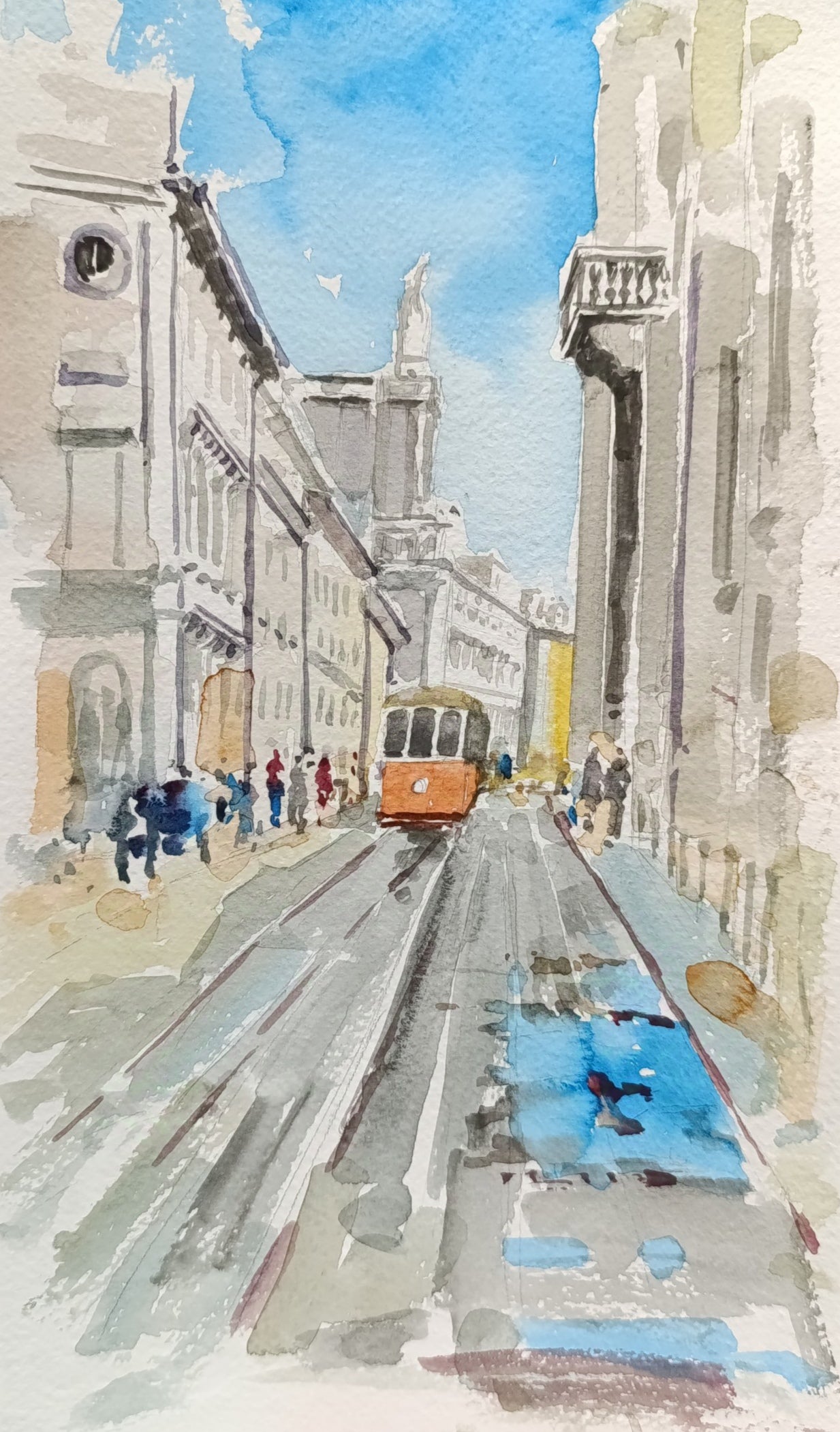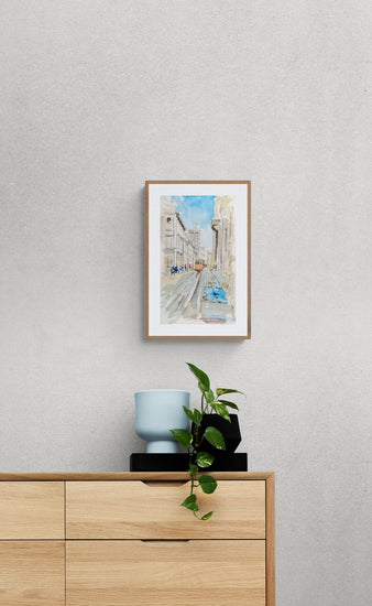This piece beautifully captures a vintage tram gliding through a historic cityscape, portrayed in a loose, expressionist style that emphasizes the movement and vibrancy of urban life. The use of light and shadow, along with a cool palette of blues and grays, contrasted by the warm tones of the tram, evoke a nostalgic atmosphere. The detailed architecture adds a sense of depth and grandeur, making this painting a captivating window into a bygone era.
