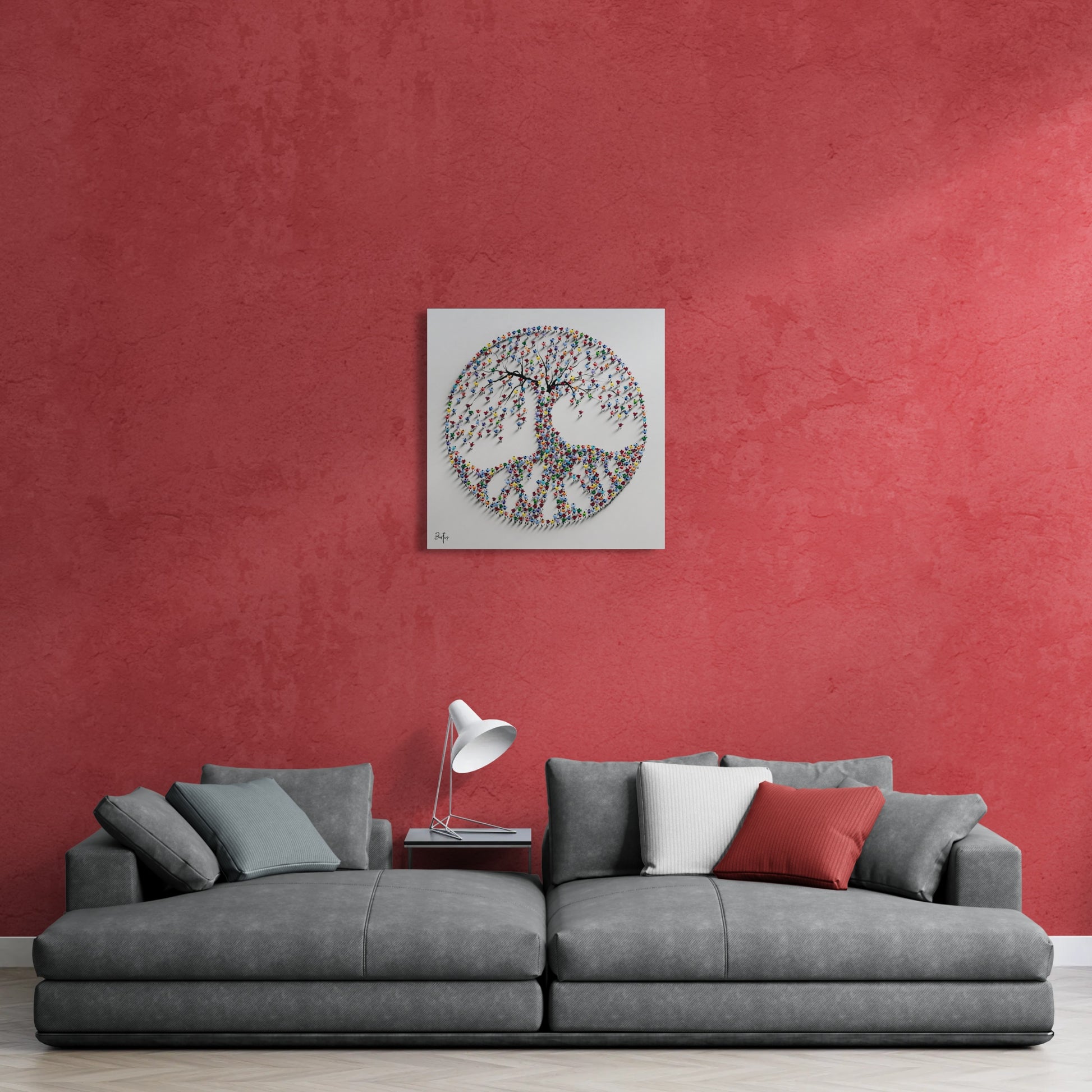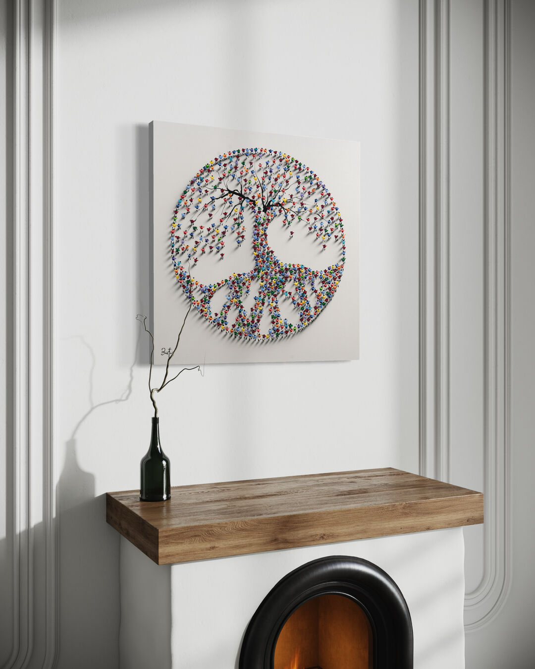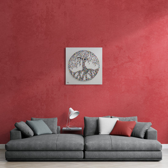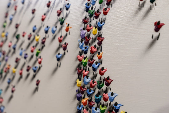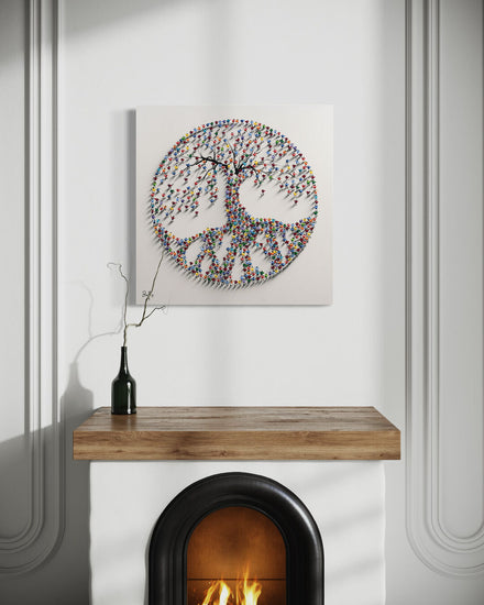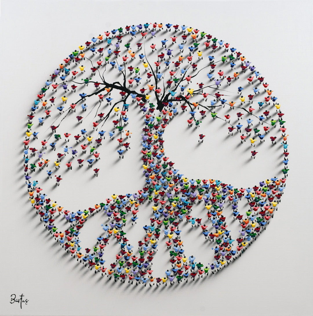 A mesmerizing sculptural artwork where countless vibrant human figures form a majestic tree, symbolizing growth, unity, and connection.