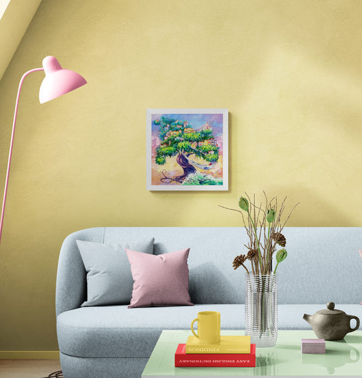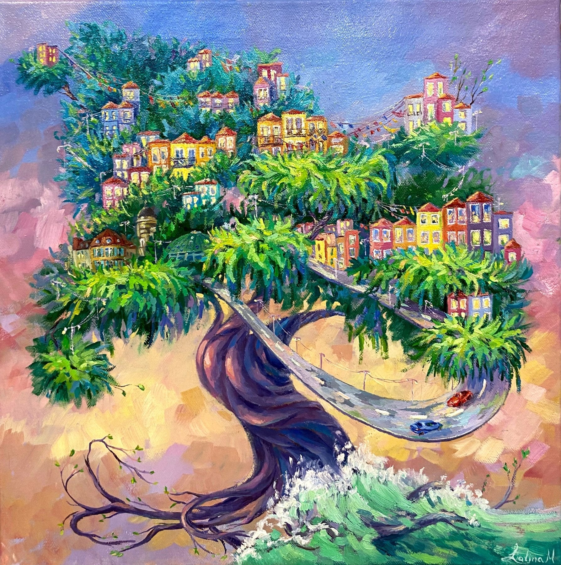 A vivid and imaginative painting that fuses the organic beauty of a tree with the bustling life of a vibrant city. The branches and leaves morph into clusters of colorful houses, as if an entire village has sprouted within the tree's canopy. Roads twist and turn around the trunk, connecting the whimsical neighborhoods that appear to grow naturally from the lush foliage. Below, waves crash against the tree’s roots, grounding this surreal fusion of nature and urban life. The painting invites viewers into a fantastical world where nature and humanity coexist harmoniously, inspiring a sense of awe and wonder.