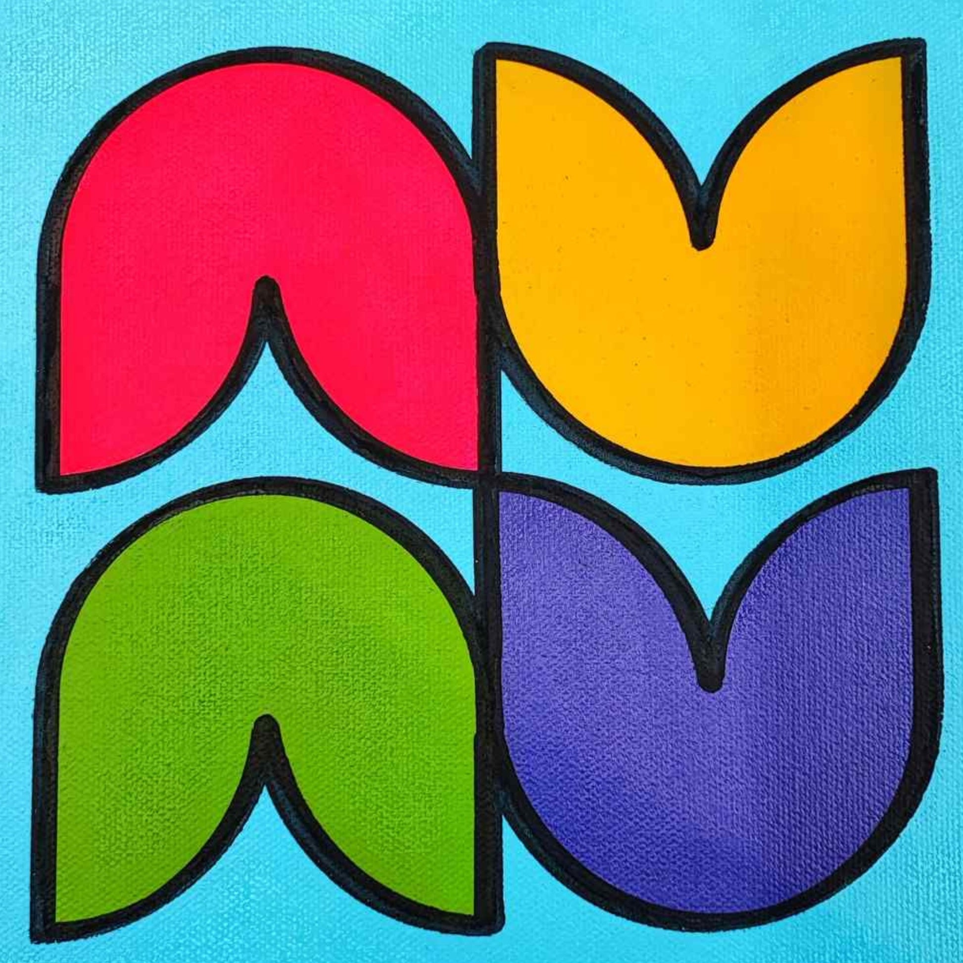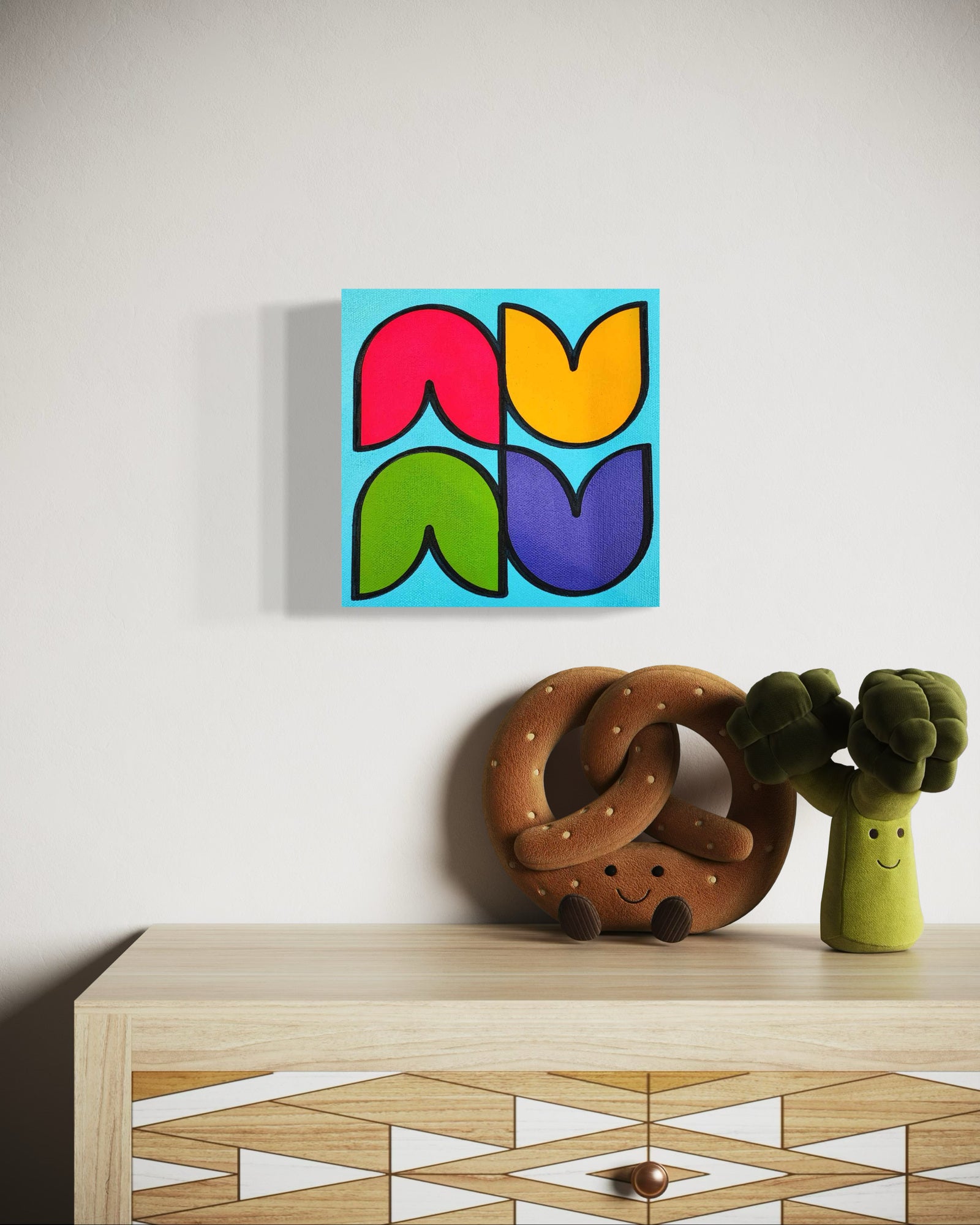 This artwork brings a modern twist to nature with its tulip-inspired geometric shapes. Boldly outlined in black and set against a serene blue background, the vibrant colors—pink, yellow, green, and purple—convey a sense of joy and harmony.