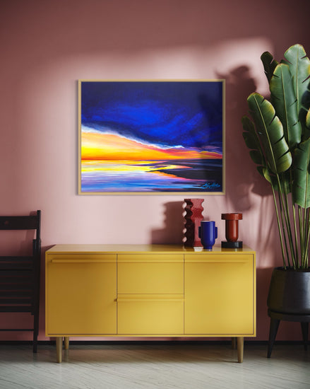 A mesmerizing view of a sunset as vibrant hues melt into the tranquil waters below. The deep, intense blue of the encroaching evening sky contrasts sharply with the fiery yellows and oranges of the setting sun, creating a dramatic and evocative scene. The water mirrors these colors in softened reflections, capturing the essence of a peaceful twilight moment. The painting invites viewers into the serene beauty of the transition from day to night, where light and shadow dance across the landscape.