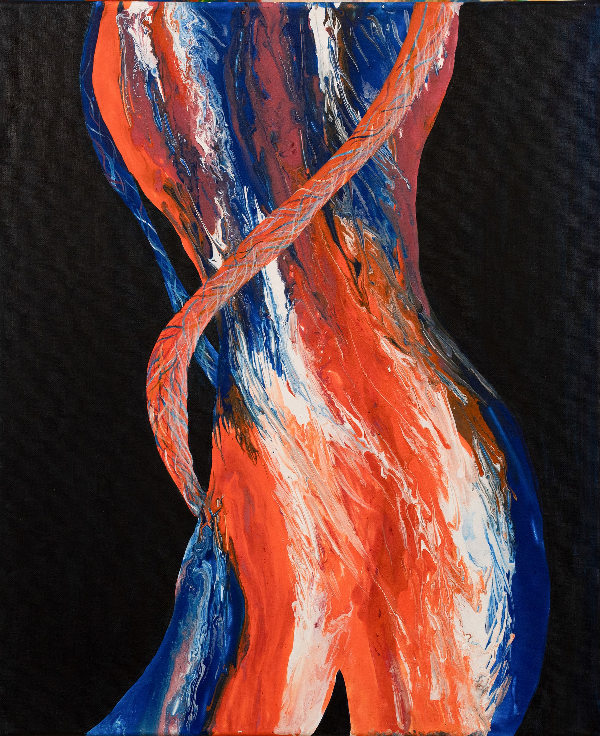 This abstract piece features intertwined, twisting forms that convey movement and tension. The vivid red and blue hues create a powerful visual impact, suggesting a dance of natural forces.