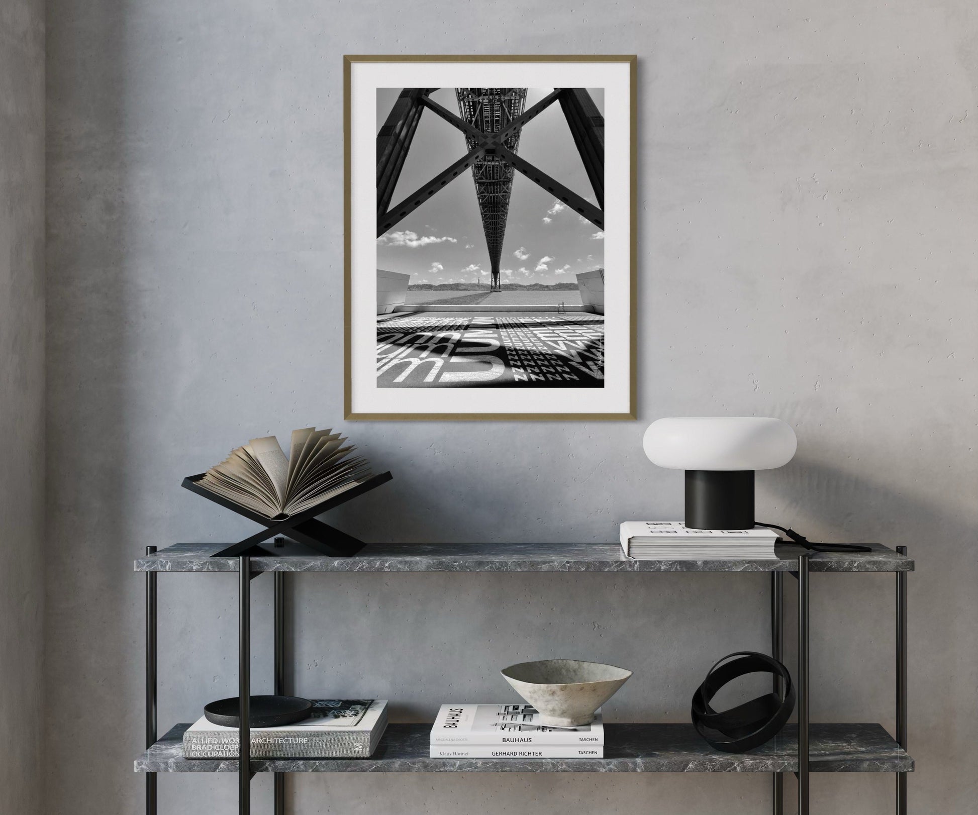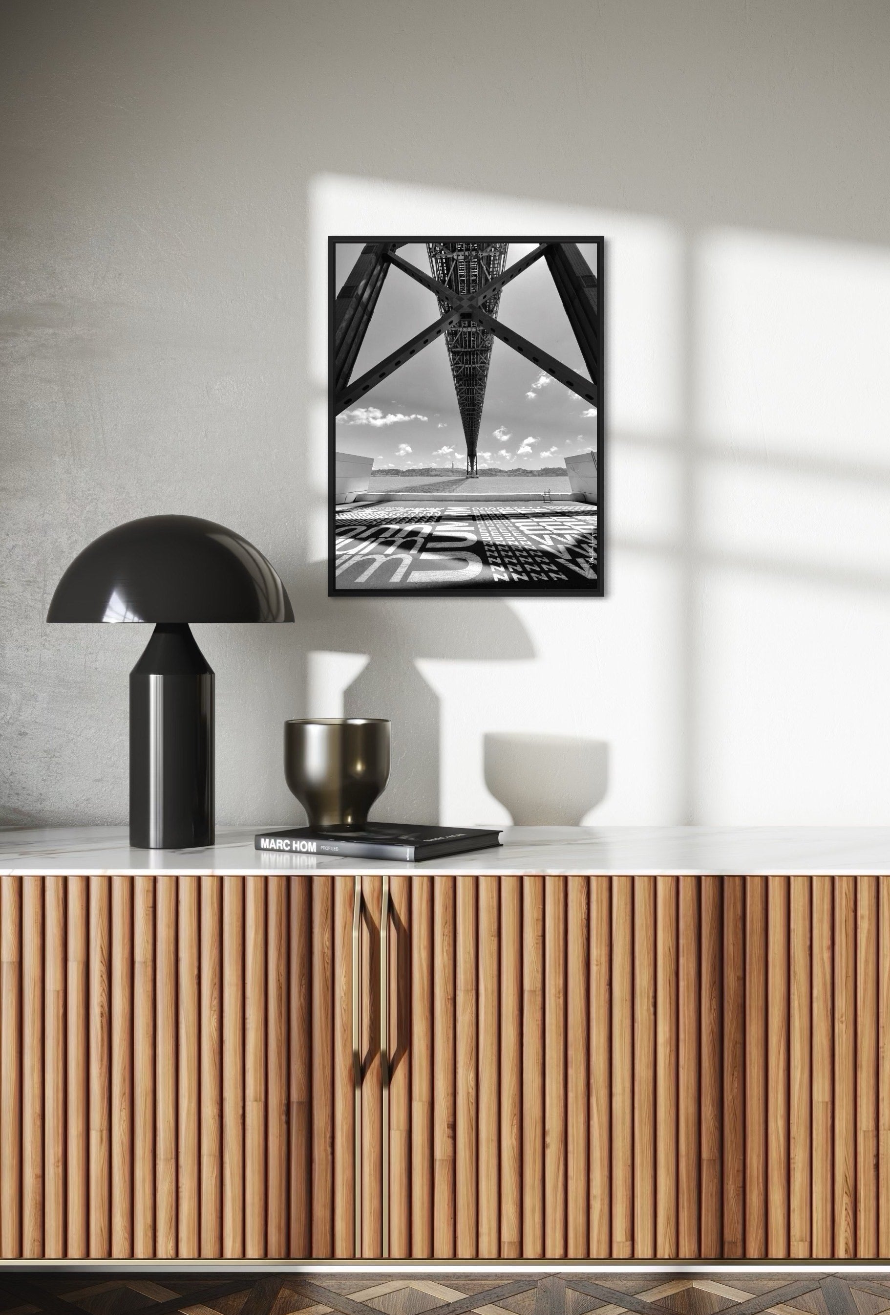 The perspective creates a sense of depth and dynamism, highlighting the bridge’s height and monumental scale. Shadows and strong black-and-white contrasts accentuate the details of the beams and structure, lending the scene a dramatic and almost surreal air. The intense daylight filters through the structures, casting light and shadow in a way that adds texture and dimension to the image.