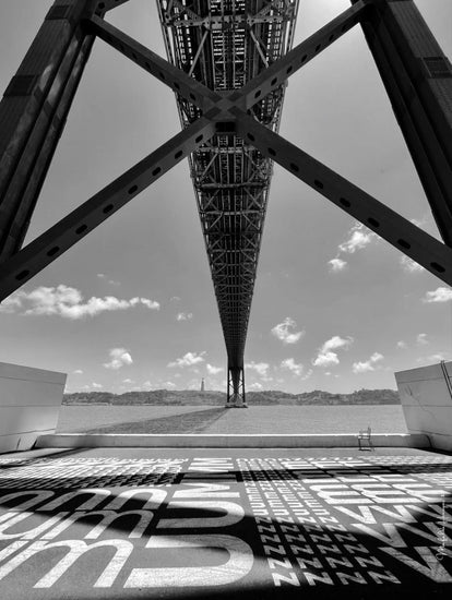 In the black-and-white photograph, the grandeur of Lisbon's 25th of April Bridge is captured from an impressive angle, revealing the complexity and beauty of its engineering.