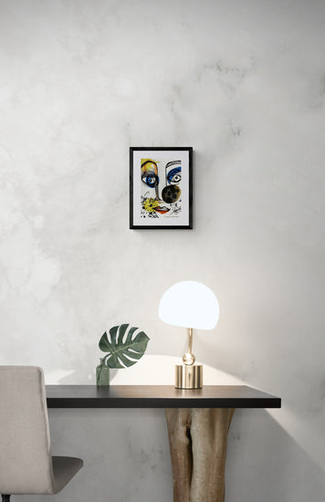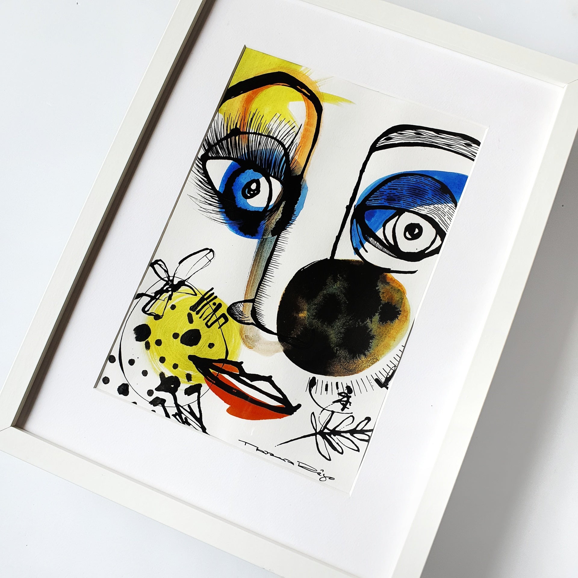 A captivating portrait that breaks convention, featuring contrasting eye designs set against a dynamic backdrop of splatters and strokes. The interplay of bold colors and graphic elements creates a fragmented yet coherent visage.