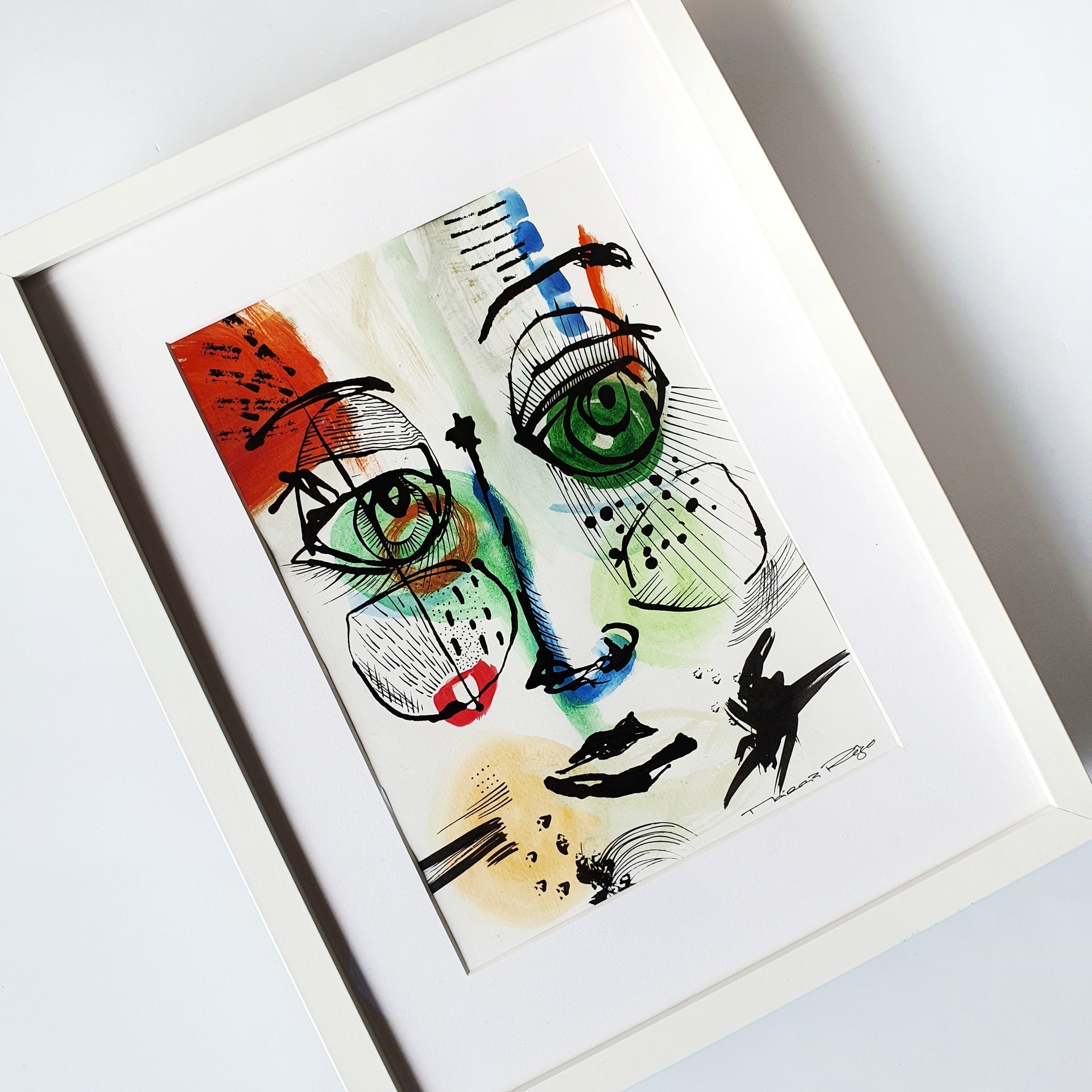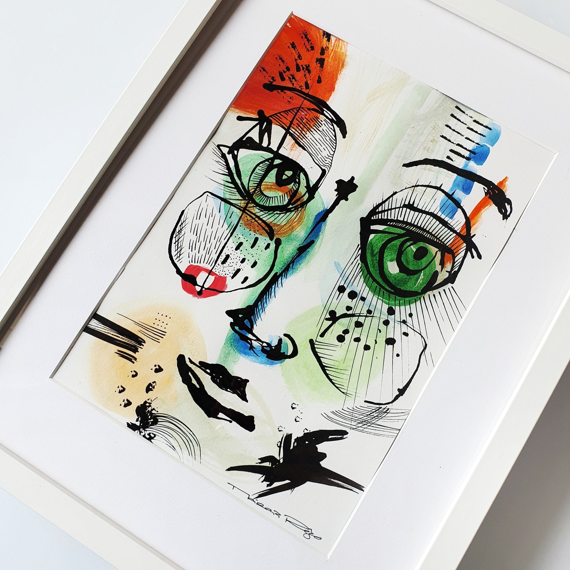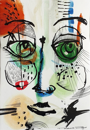 This artwork features a pair of stylized eyes, each a mix of geometric and organic lines and shapes, vividly portrayed against a backdrop splashed with bold colors and spontaneous strokes.