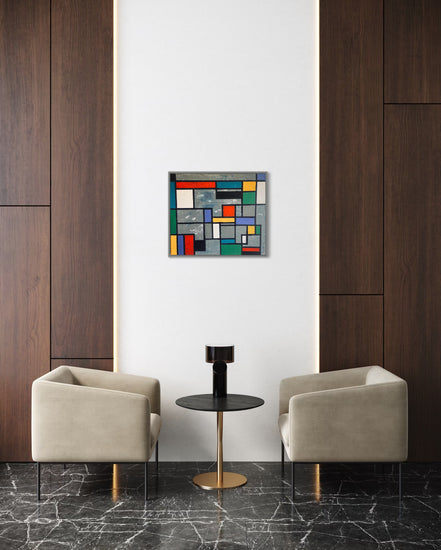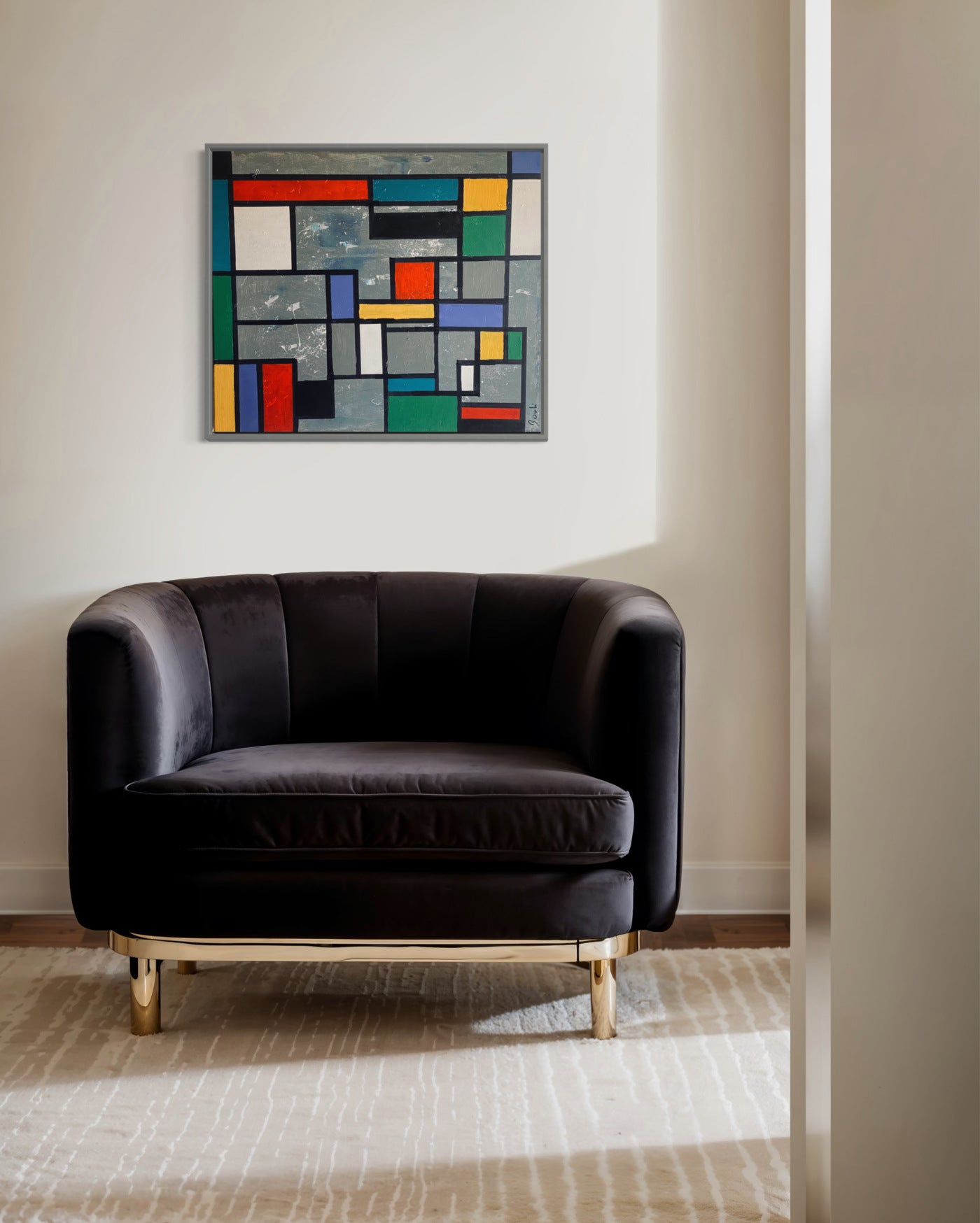 A rhythmic interplay of colour and space, “Urban Gridlock” channels city energy into a geometric symphony. Order meets spontaneity in this bold visual structure.