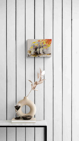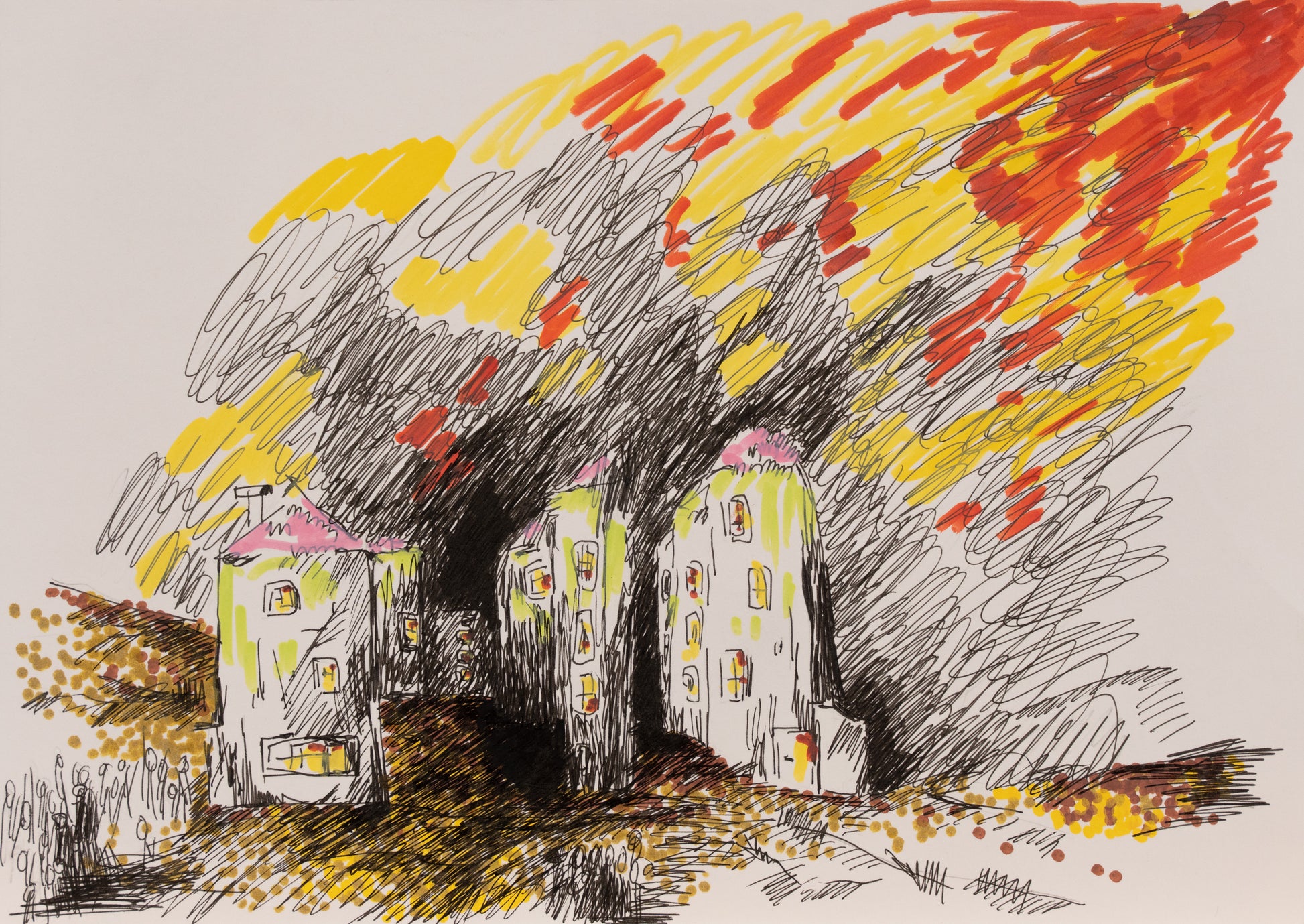 This artwork depicts a scene of burning buildings under a tumultuous sky, with fiery hues engulfing the landscape. The expressive strokes and bold contrasts capture the intensity of the scene, reflecting a powerful sense of chaos and destruction.