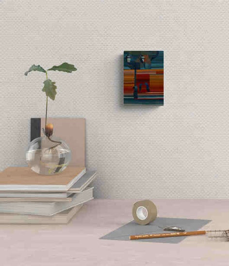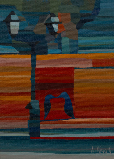 This artwork captures the essence of an urban scene with stylized lampposts and a vivid, colorful background. The geometric forms and rich color palette reflect the vibrancy and complexity of city life.