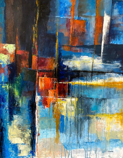 A striking abstract piece that captures the essence of a bustling cityscape through bold strokes, vivid colors, and layered textures. The interplay of blues, oranges, and reds evokes the lights and shadows of an urban environment, while the vertical and horizontal lines suggest towering buildings and streets. Paint drips and blended hues mimic reflections on wet surfaces, as if one is looking at the city mirrored in a rainy pavement. This piece invites viewers to dive into the vibrant energy of urban life, highlighting its beauty amid chaos and motion.