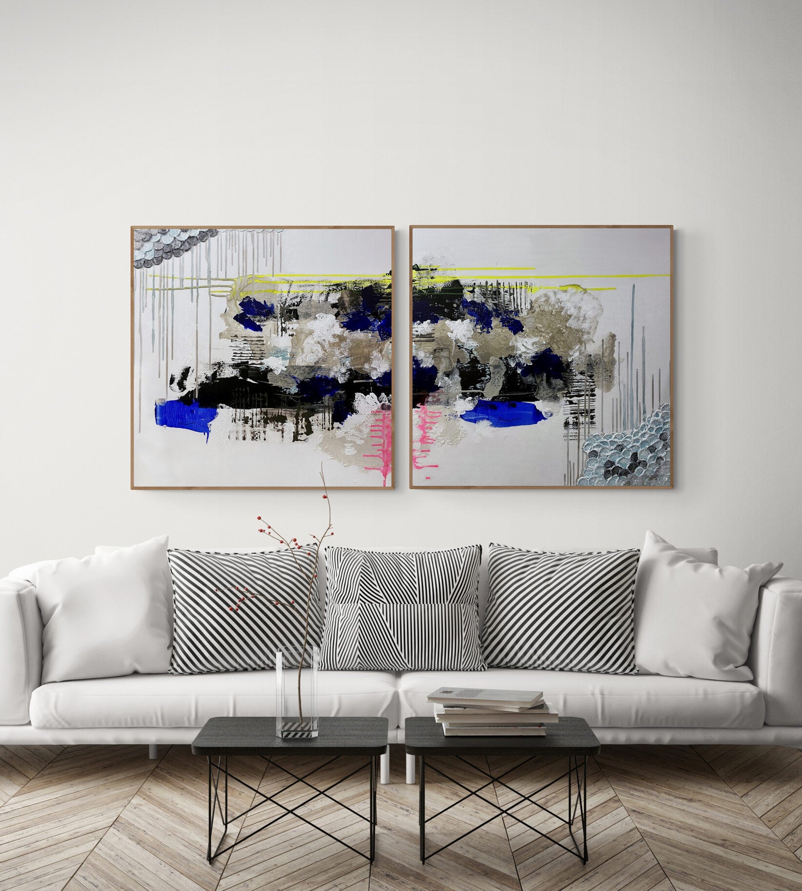 Ideal for contemporary interiors, this diptych serves as a cohesive centerpiece, infusing energy and sophistication into any space. The pairing captures a balance between raw expressiveness and composed minimalism, inviting viewers into a layered exploration of color and texture.