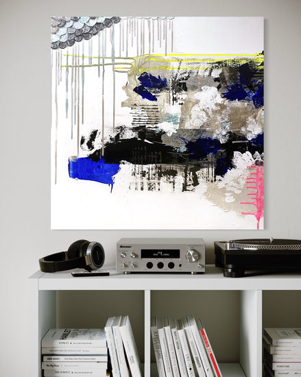 This piece is an abstract artwork presented as part of a diptych, with two panels meant to complement each other visually. The painting features textured layers, dynamic drips, and a striking color palette that includes vibrant blue, pink, and hints of metallic tones against a neutral background. The textured upper area and expressive strokes add depth and movement, evoking a sense of urban landscapes or natural elements like clouds and rain.