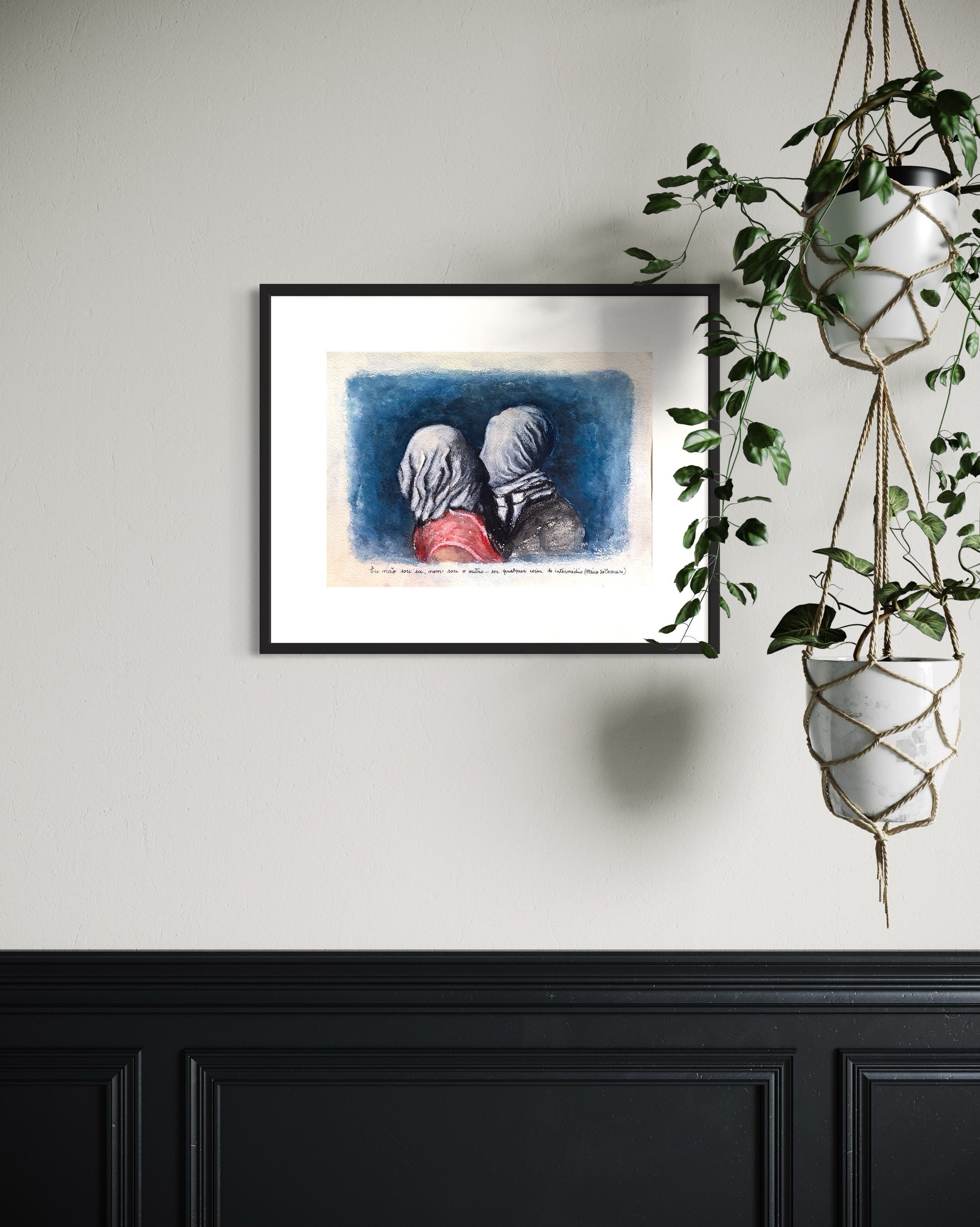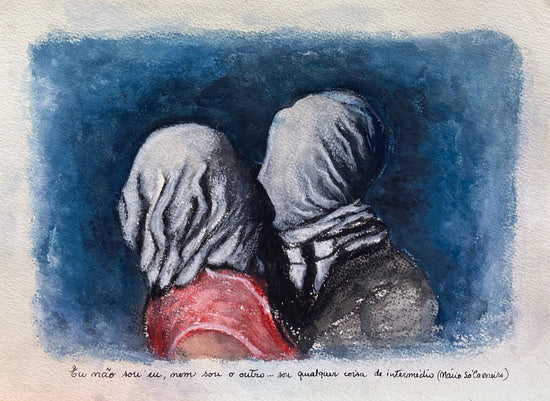 A haunting moment between two figures whose faces are shrouded in cloth, creating an atmosphere of mystery and anonymity. The piece explores themes of intimacy and separation, as well as the barriers that can exist between individuals, even in closeness. The deep blue background enhances the sense of isolation, while the poetic inscription at the bottom, “Eu não sou eu, nem sou o outro… sou qualquer coisa de intermédio” (by Mário de Sá-Carneiro), suggests a profound reflection on identity and the space between self and other. This artwork resonates with feelings of melancholy and longing, inviting the viewer to ponder the complexities of connection.