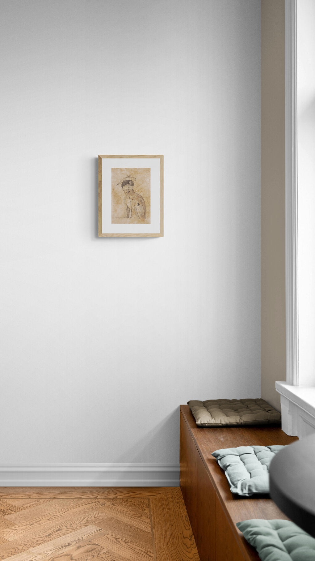 This artwork intriguingly blends symbolism and portraiture, depicting a figure with a blindfold, topped with a sunhat adorned with a rose. The blindfold suggests themes of obscured vision or unseen realities, while the rose adds a touch of natural beauty, hinting at hidden depths and the complexity of perception. The detailed execution of the figure’s torso, showing a tattoo of a smaller figure, further plays with the idea of layers and inner stories.
