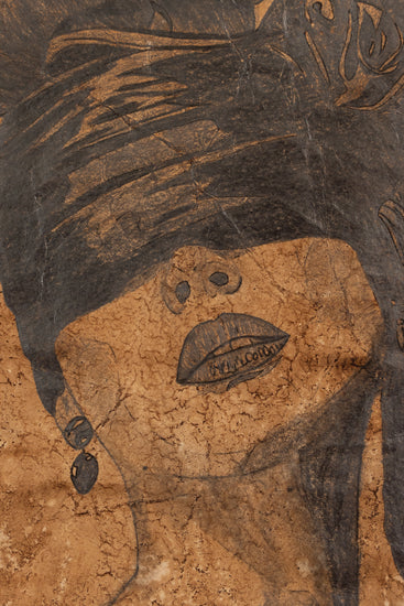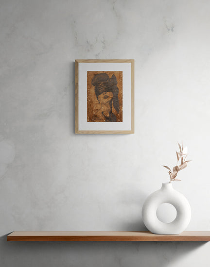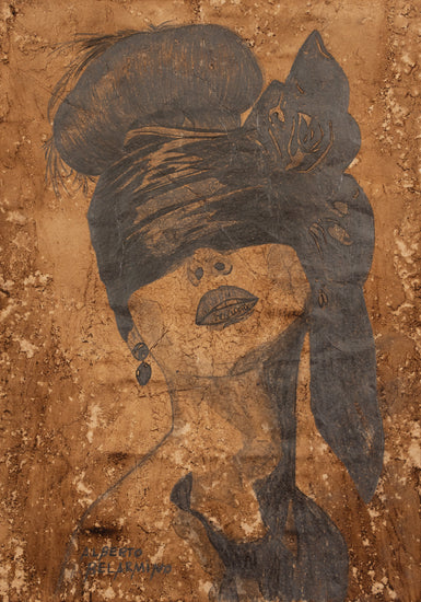 The artwork presents a woman's face partially obscured by a shadowy veil, with roses blending into the dark tones of her surroundings. This piece plays with light and shadow to evoke a mood of hidden depths and intrigue.