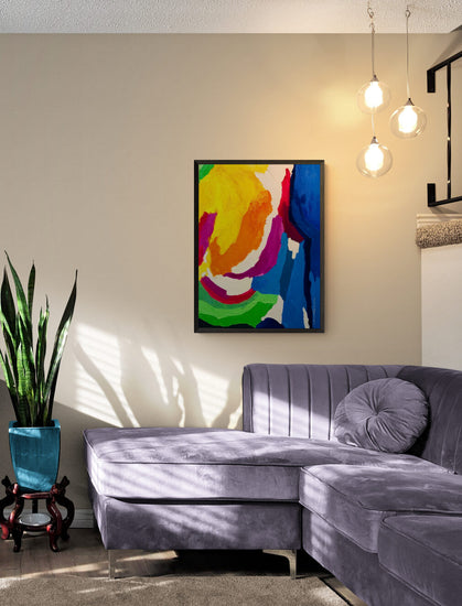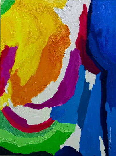 A swirling blend of rich yellows, oranges, deep blues, and purples, accented by bright greens, seems to dance across the canvas, feelings of joy and spontaneity. The texture of the paint adds depth, allowing the viewer to experience the painting on both a visual and tactile level. The dynamic composition invites exploration, making it a evoking centerpiece in any modern art collection.