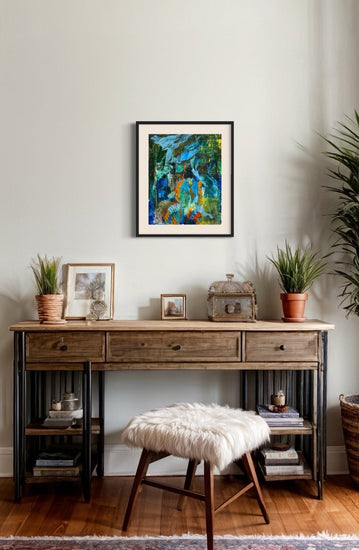 Essence of a lush, mystical forest, infused with a sense of depth and movement. The swirling greens, blues, and hints of vibrant orange and yellow evoke the interplay of light filtering through dense foliage, creating an ethereal, dreamlike atmosphere. The abstract forms suggest leaves and flowing water, inviting viewers to immerse themselves in a hidden world of natural beauty and wonder. This piece resonates with the energy and serenity of untouched landscapes, blending imagination with the raw textures of the forest.