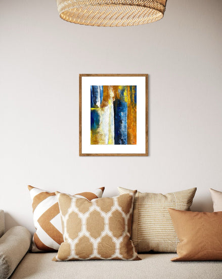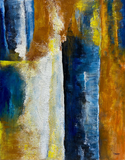 This is a striking abstract piece that plays with depth, texture, and contrast. Dominated by bold vertical bands of color, this work juxtaposes rich earthy tones of amber and ochre against cool, deep blues and whites. The central white section, textured and layered, creates a sense of light breaking through, giving the painting a sense of vastness and tranquility, reminiscent of towering rock formations or a rugged cliffside meeting a bright sky. The bold use of texture adds dimension, inviting viewers to explore the subtle nuances of the surface.