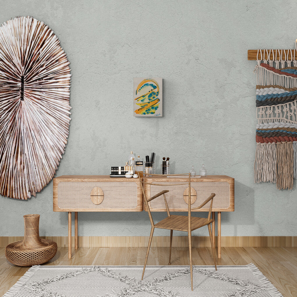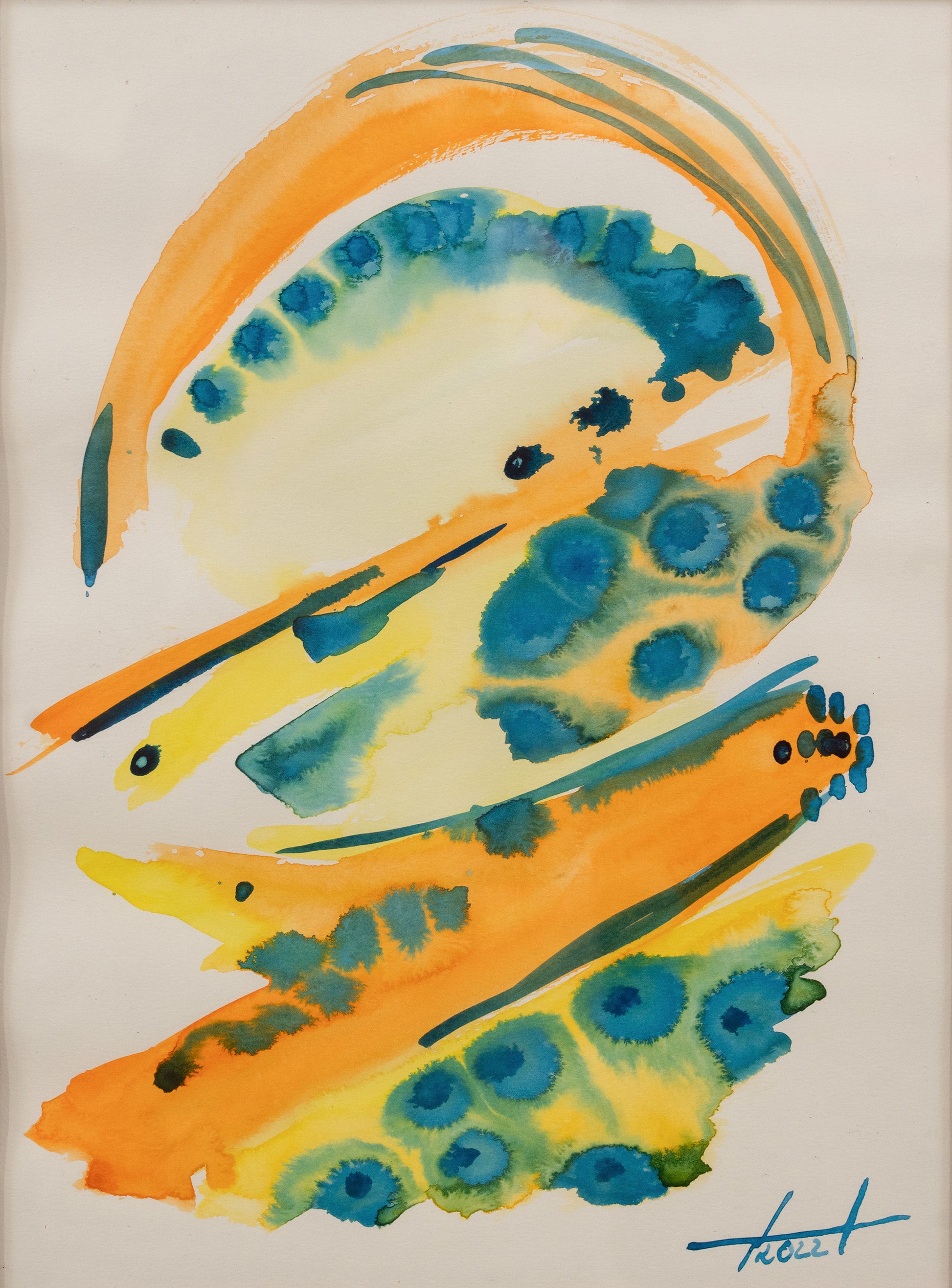 This abstract painting features fluid, swirling patterns in bright shades of orange, yellow, and green, accented with blue. The watercolor technique creates a sense of movement and harmony, with soft edges and blending colors. The composition evokes a feeling of natural energy and organic forms, resembling waves or foliage. The light, airy brushstrokes add a sense of spontaneity and freshness to the piece.