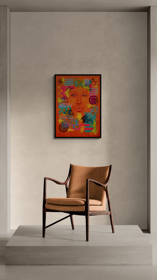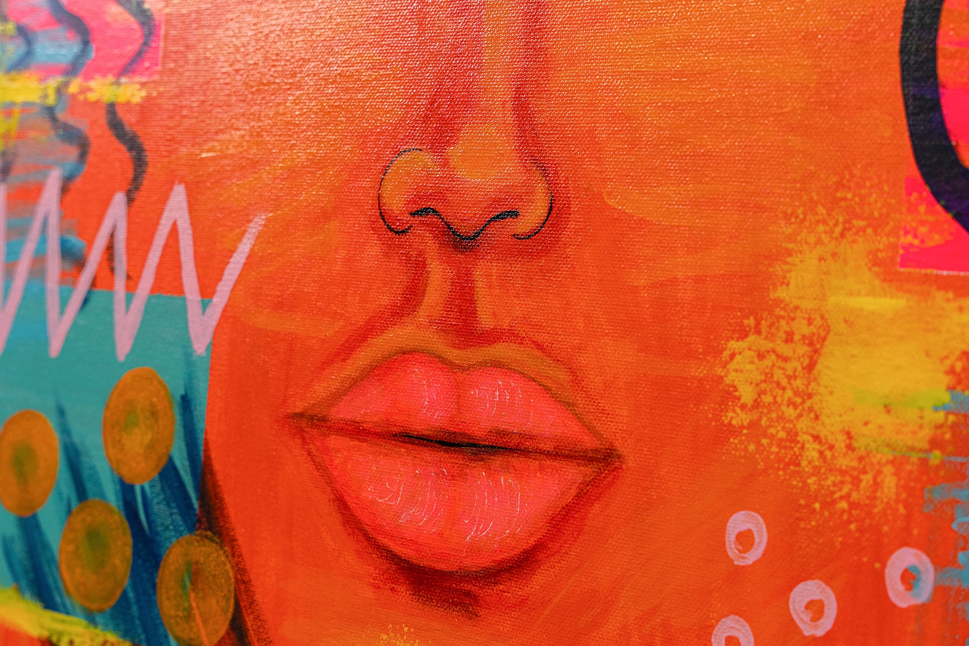 The painting is a colorful and abstract representation of a face, centralized on a vivid orange background. Abstract shapes and various patterns in striking colors such as pink, blue, green, and yellow surround the features of the face, creating a tapestry of visual stimuli.