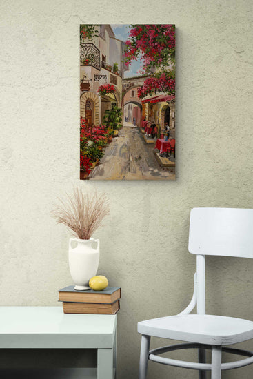 A picturesque view of a quaint village street adorned with vibrant flowers. The detailed brushwork and warm colors create a welcoming and nostalgic atmosphere.