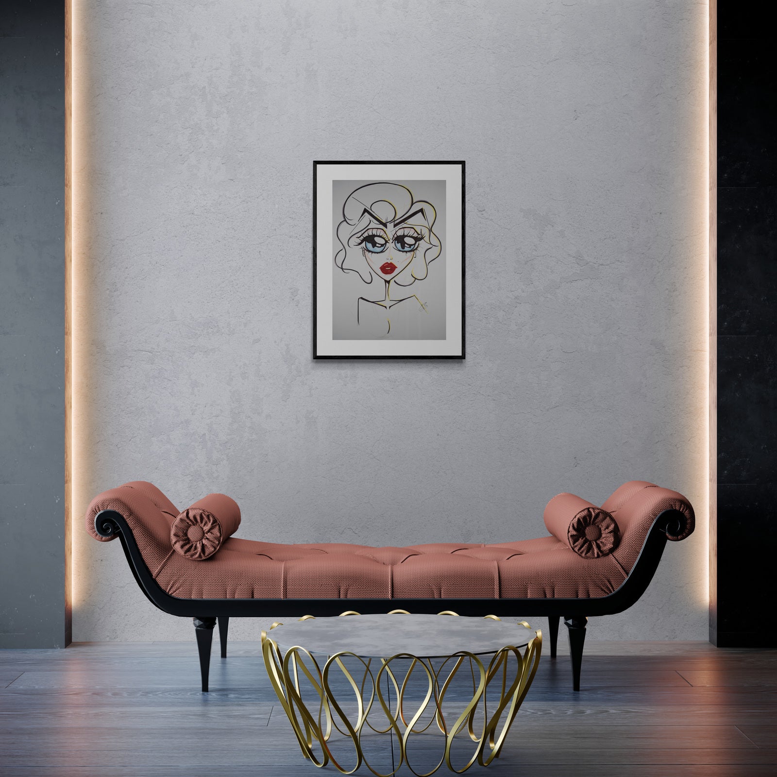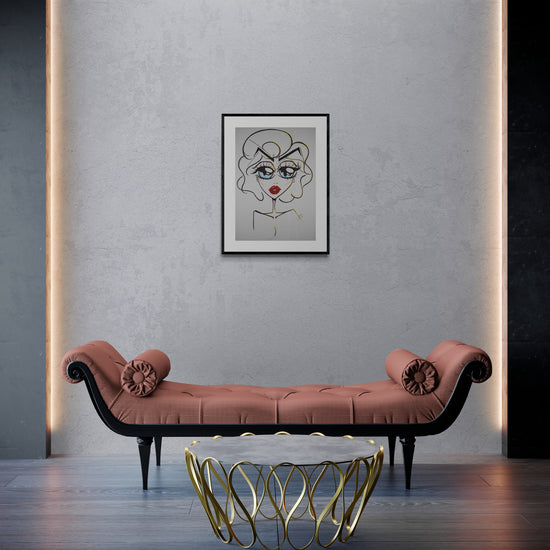 A glamorous woman with voluminous wavy hair, highlighted by a minimalist hairband. Her bold makeup features striking blue eyes and full, red lips, creating a classic yet contemporary look.