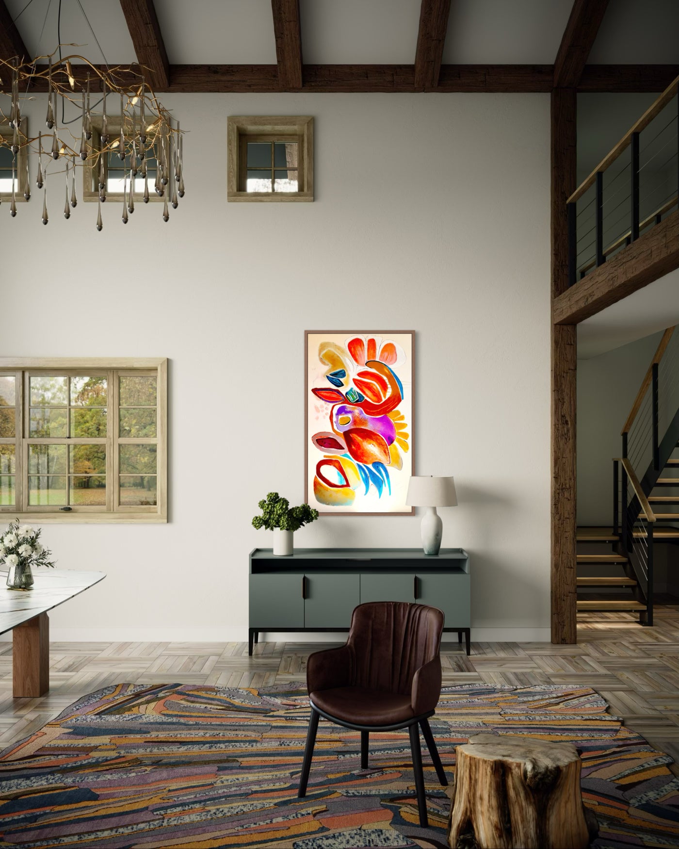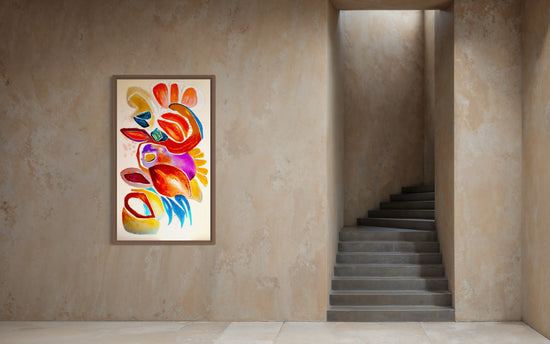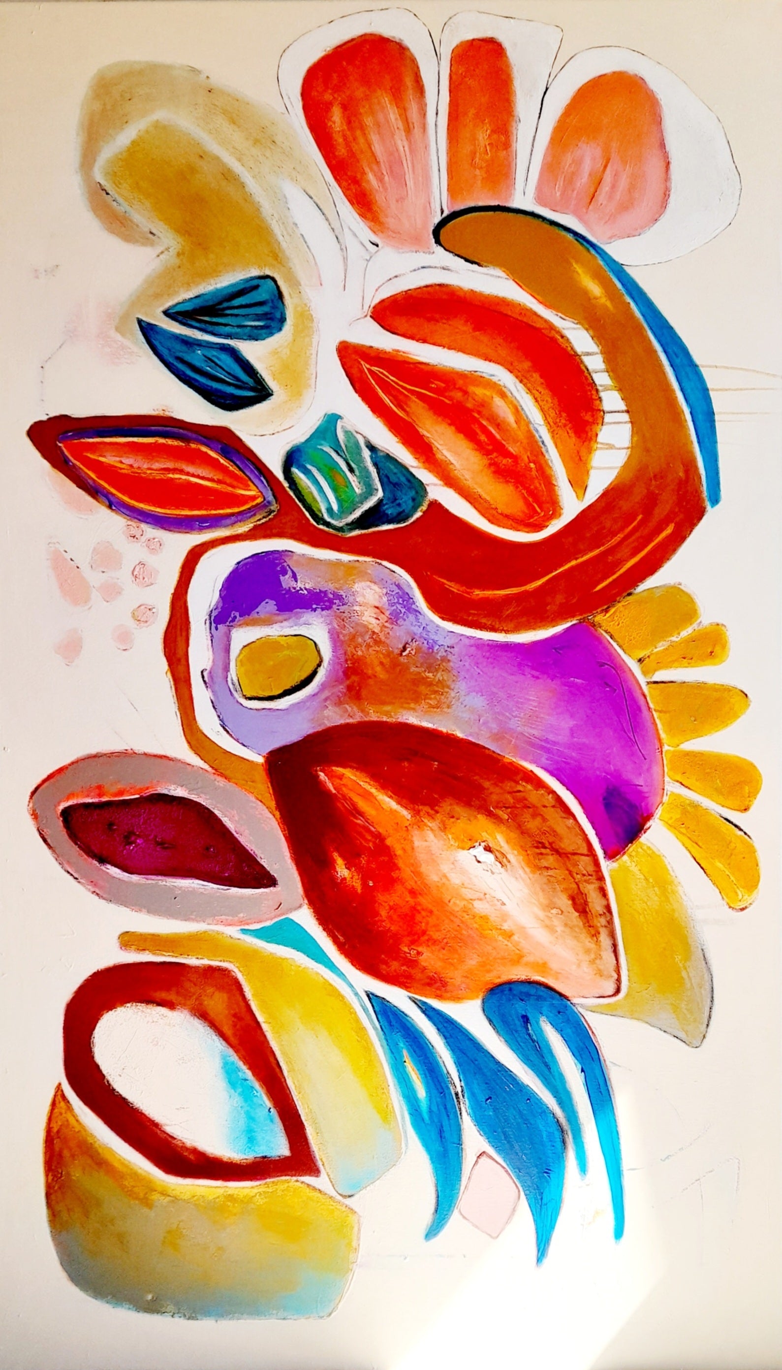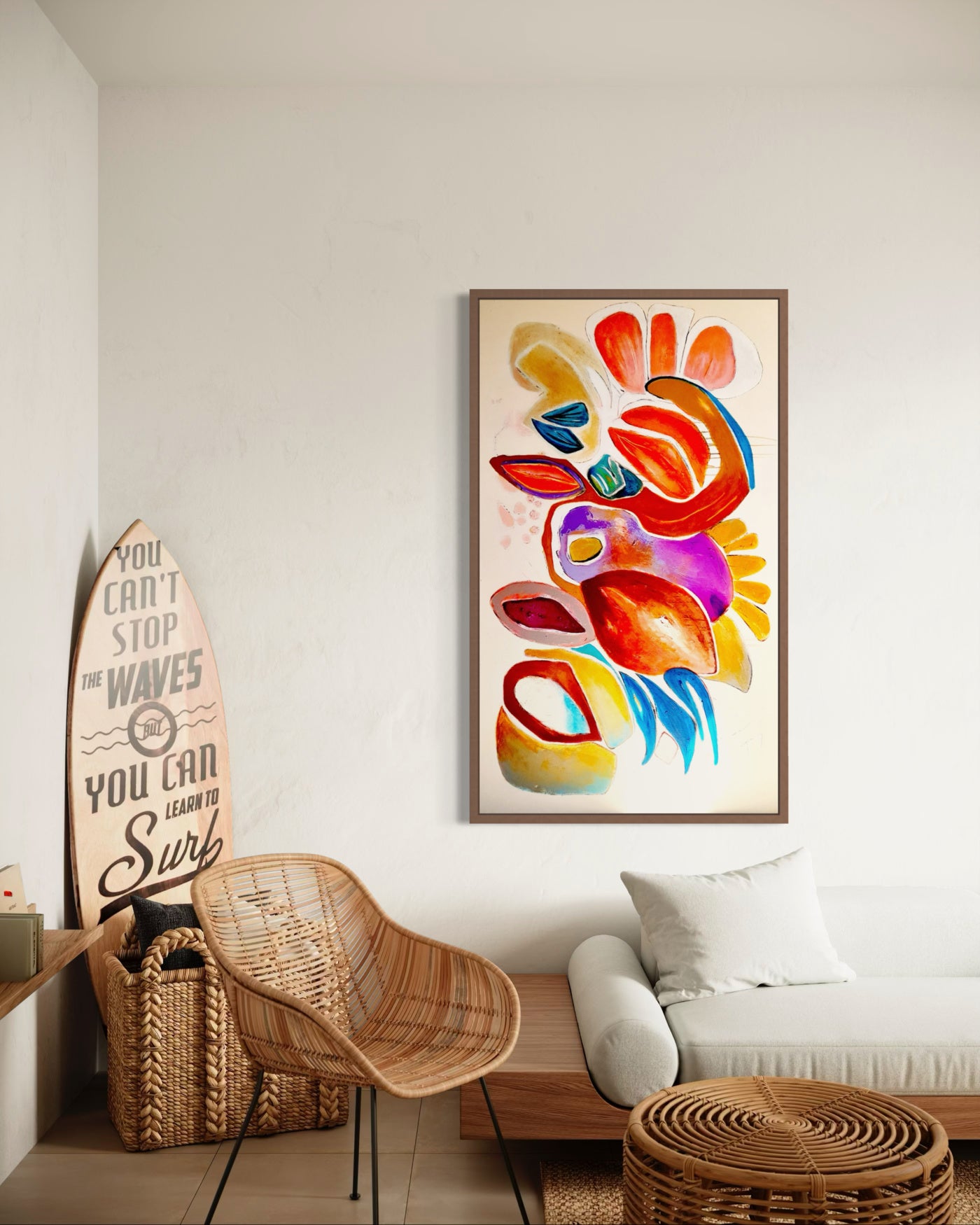 A vivid burst of colour and movement invites the viewer to dive into an abstract garden of organic forms and joyful rhythm. Each shape pulses with energy, evoking a sense of nature in bloom — but filtered through imagination.