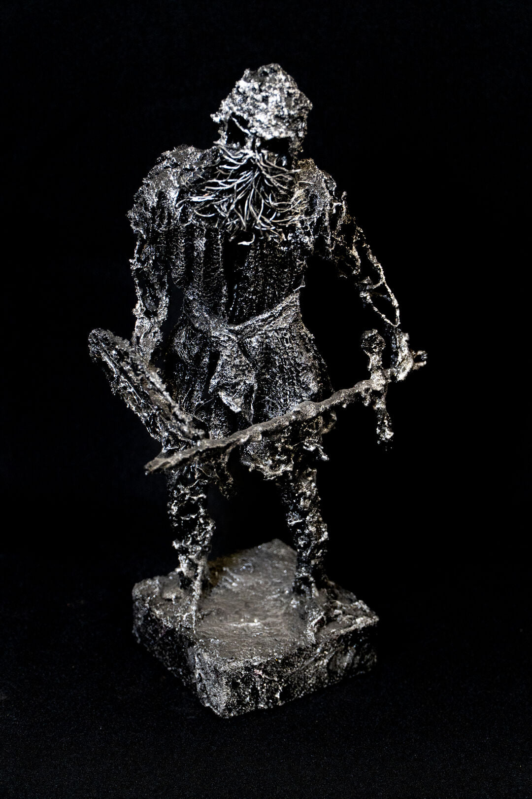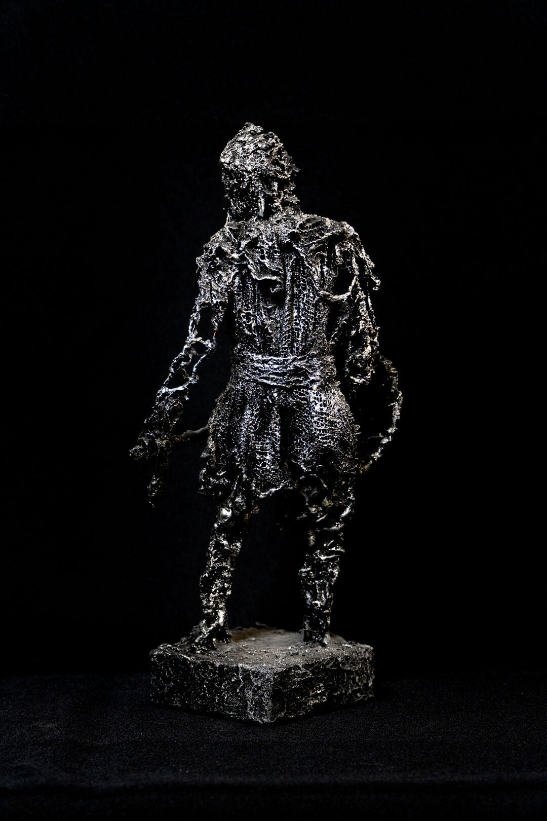 A hauntingly powerful sculpture that captures the essence of a battle-worn figure emerging from darkness. Crafted with intricate detail, the textured surface and imposing stance exude strength and resilience, while the figure’s faceless, armored appearance imbues it with a sense of timeless mystery. This piece invokes the spirit of an ancient guardian, standing solemnly as a symbol of courage, endurance, and the silent resolve of warriors throughout history. The rough, almost fragmented surface adds to its rugged allure, as if it has survived countless encounters and remained steadfast.