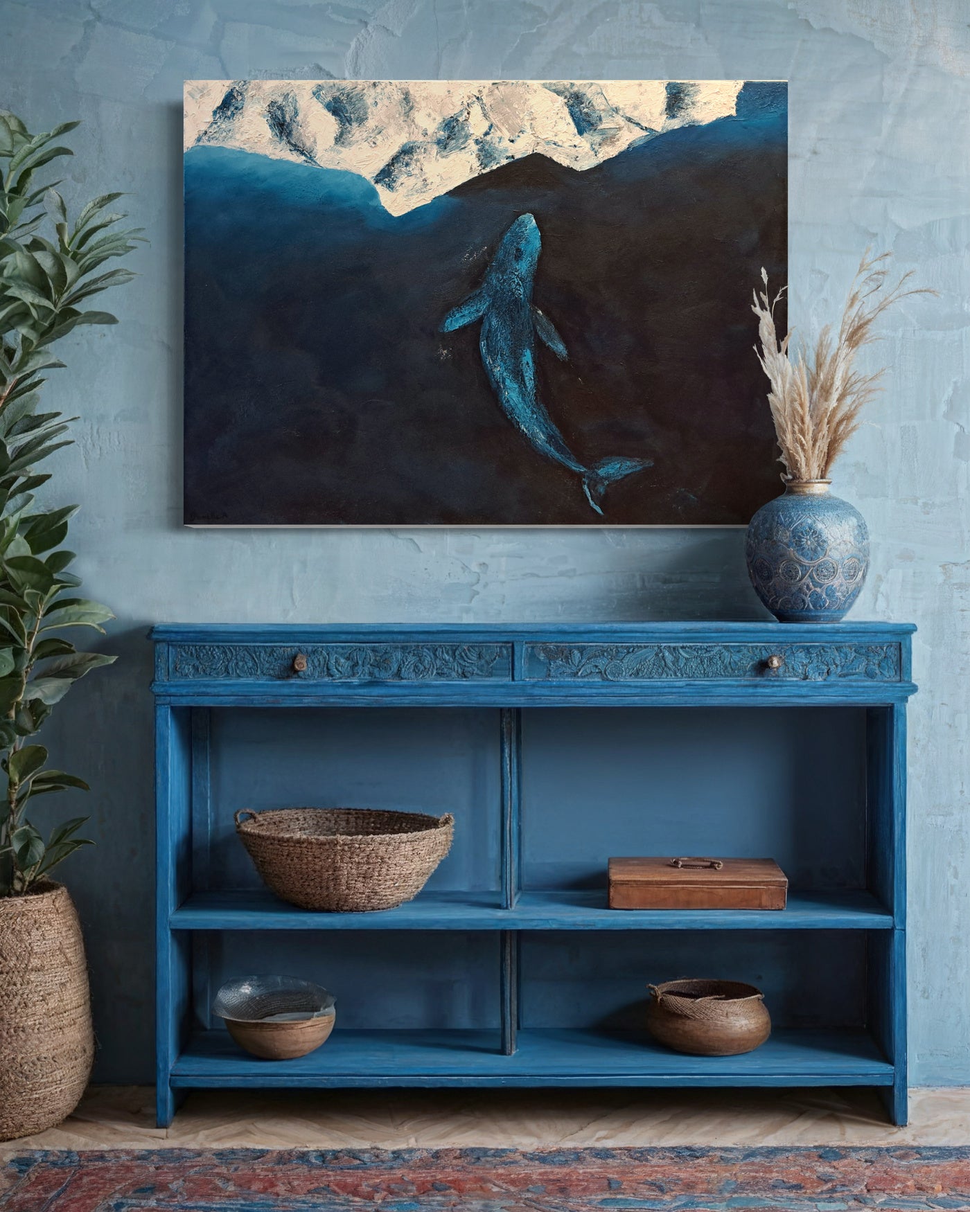 The use of blue tones creates a calm, contemplative atmosphere, evoking the quiet beauty and vastness of the ocean.