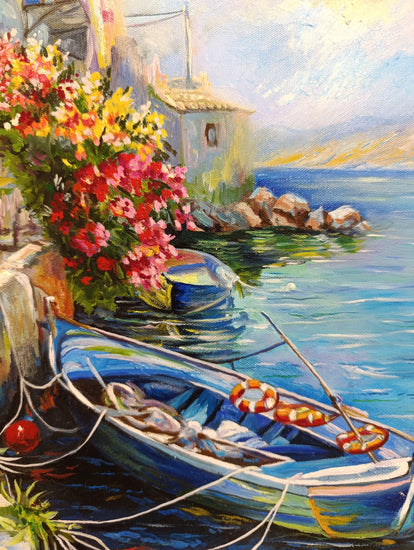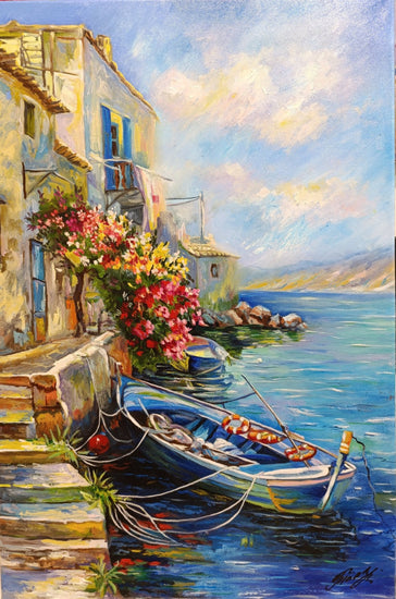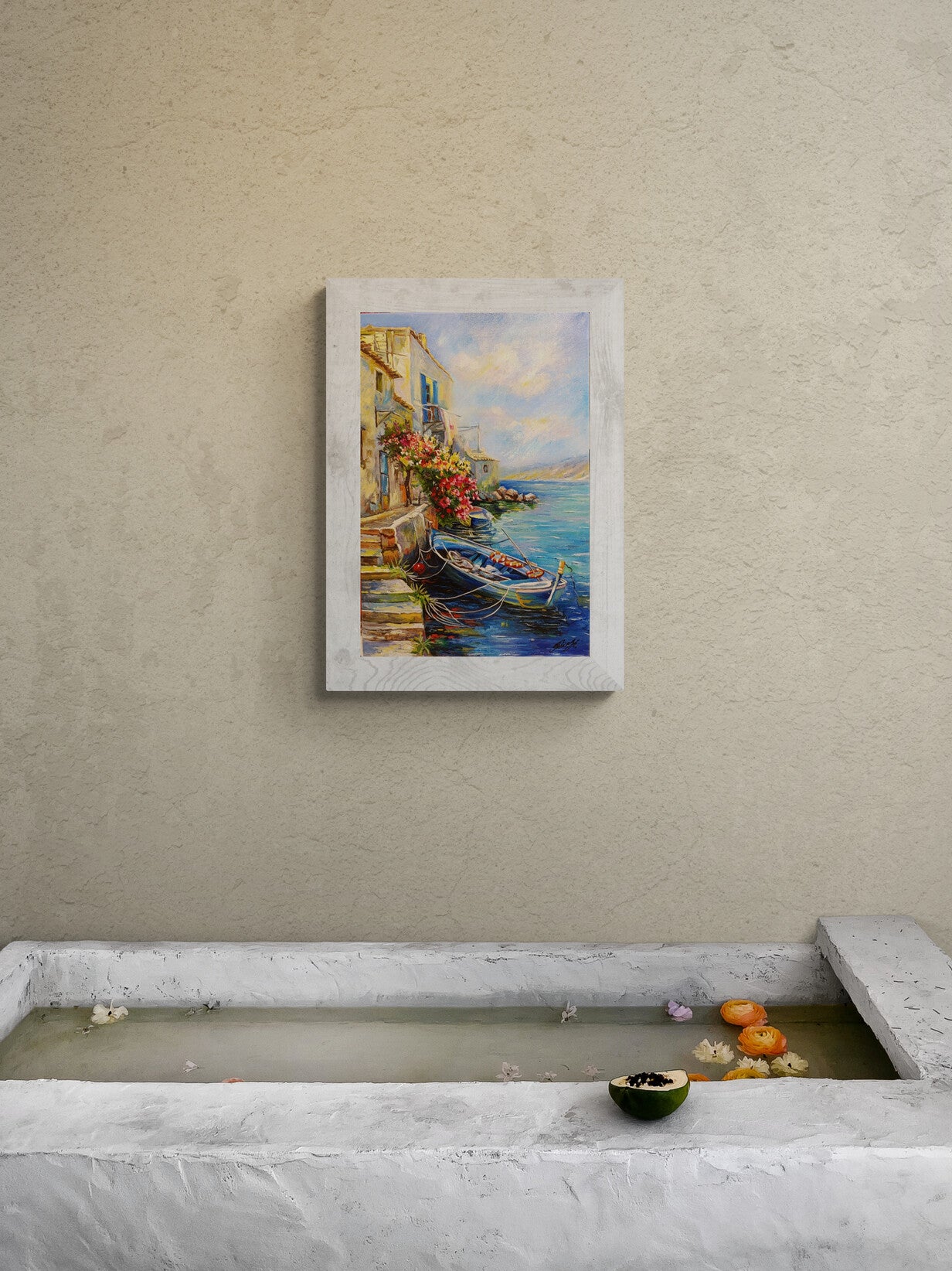Peaceful moment as a lone boat rests gently against an old stone shore. The weathered stones, bathed in the soft light of day, tell stories of countless tides that have kissed their surface. The painting evokes a sense of quiet solitude and timeless beauty, inviting the viewer to pause and listen to the whispers of the shore and the calming embrace of nature.