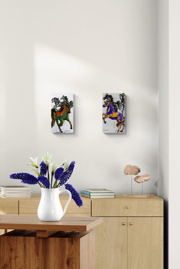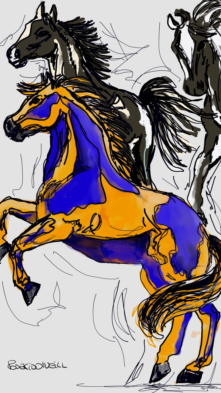 The central horse is depicted with a vibrant blend of deep orange and electric blue, exuding a powerful and untamed presence. Accompanying it are two other horses rendered in strong, contrasting black and white strokes, adding depth and harmony to the composition. The use of bold lines and color blocking emphasizes the power and vitality of these majestic creatures. The minimalist background allows the focus to remain entirely on the horses' graceful and energetic forms as they gallop and rear with unbridled freedom.