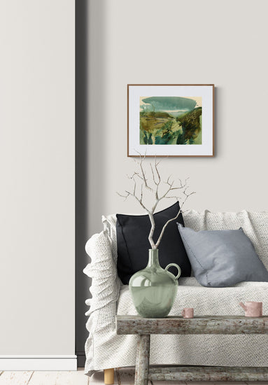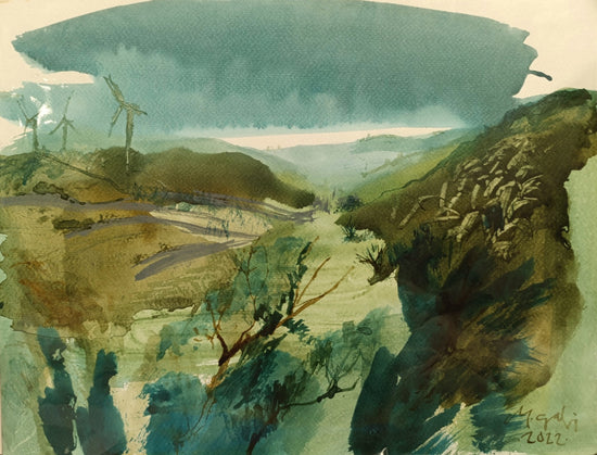 This atmospheric watercolor painting immerses the viewer in a lush, rolling landscape dominated by earthy greens and deep blues. Wind turbines stand gracefully on the horizon, blending modernity with nature's timeless beauty. The flowing, organic strokes capture the movement of wind through the hills, while the layering of colors evokes the depth and richness of the terrain. The overall mood is serene and reflective, with the turbines symbolizing the harmony between nature and technology.