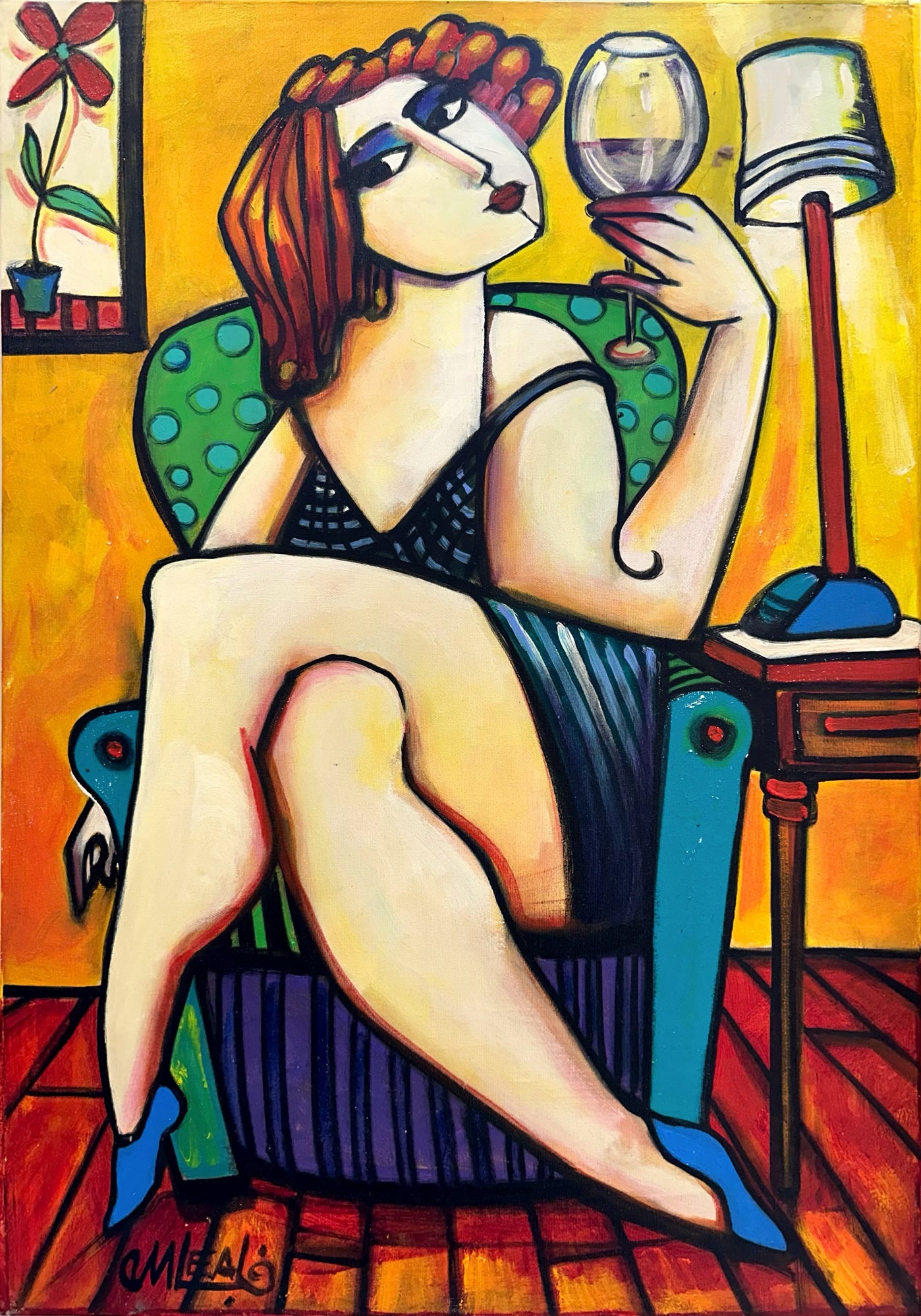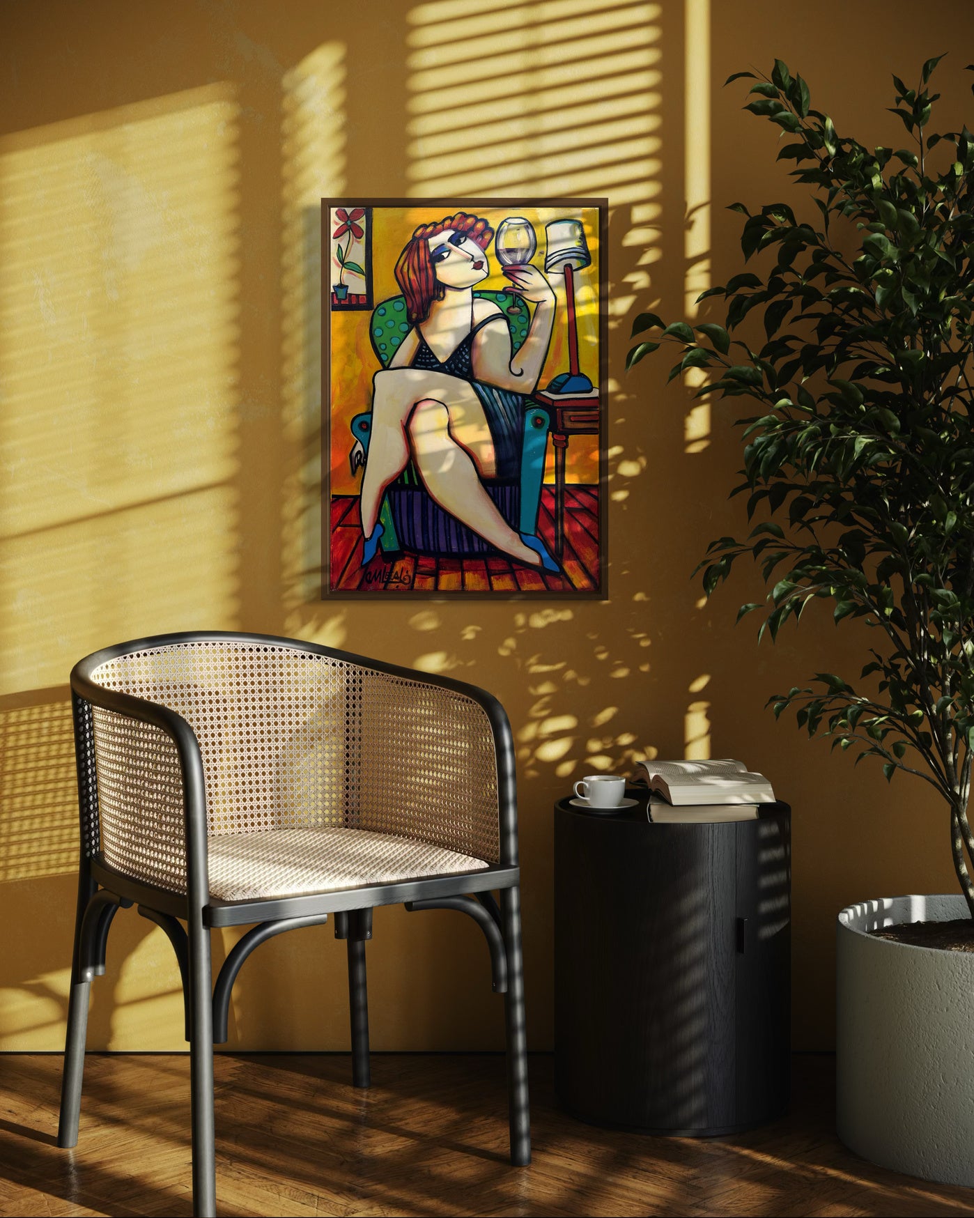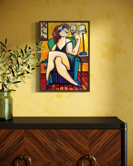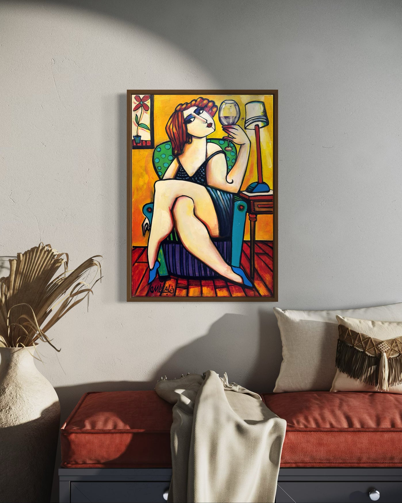 A beautiful expressionistic depiction of a woman savoring a glass of wine in a bold, colorful interior setting, showcasing strong outlines and confident brushstrokes.