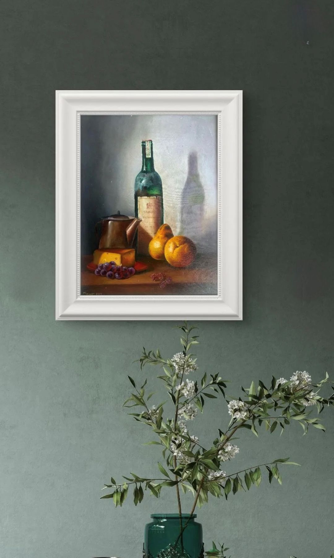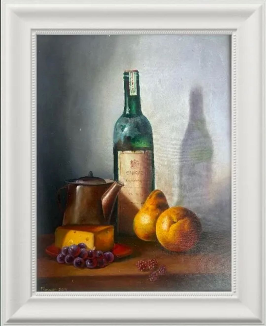 Wine Time by Maryam Besharati is an ode to timeless indulgence. A bottle of wine stands elegantly beside ripe pears, a wedge of golden cheese, and a polished metal teapot — a tableau that celebrates the art of savouring life’s simple pleasures.