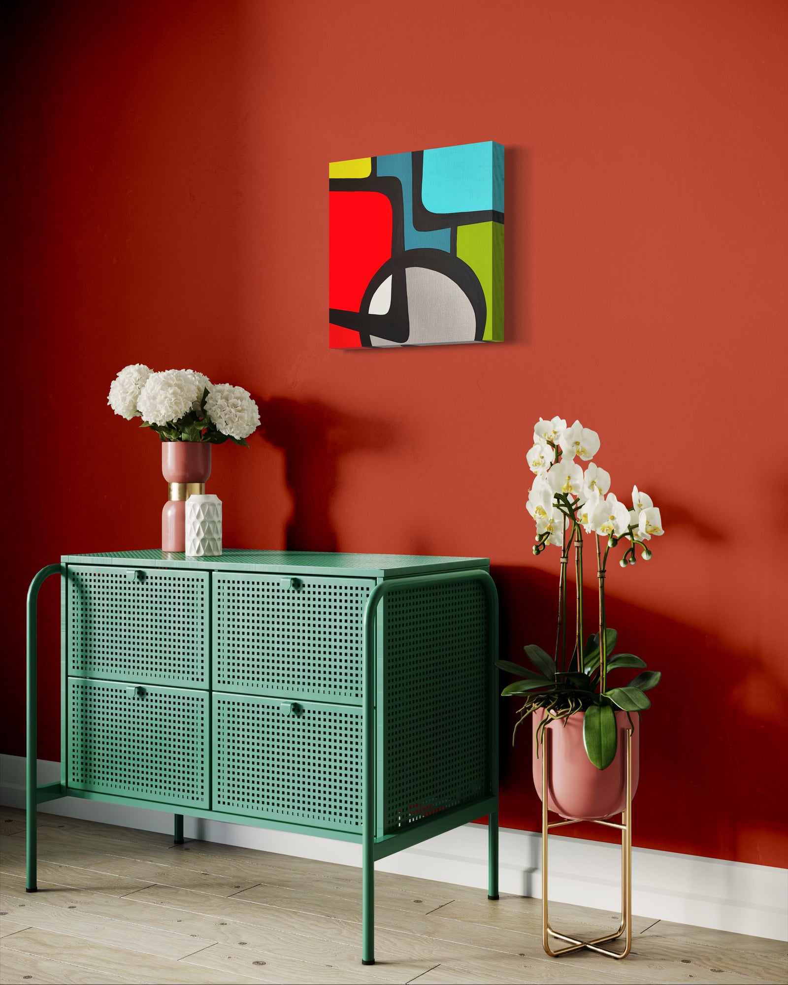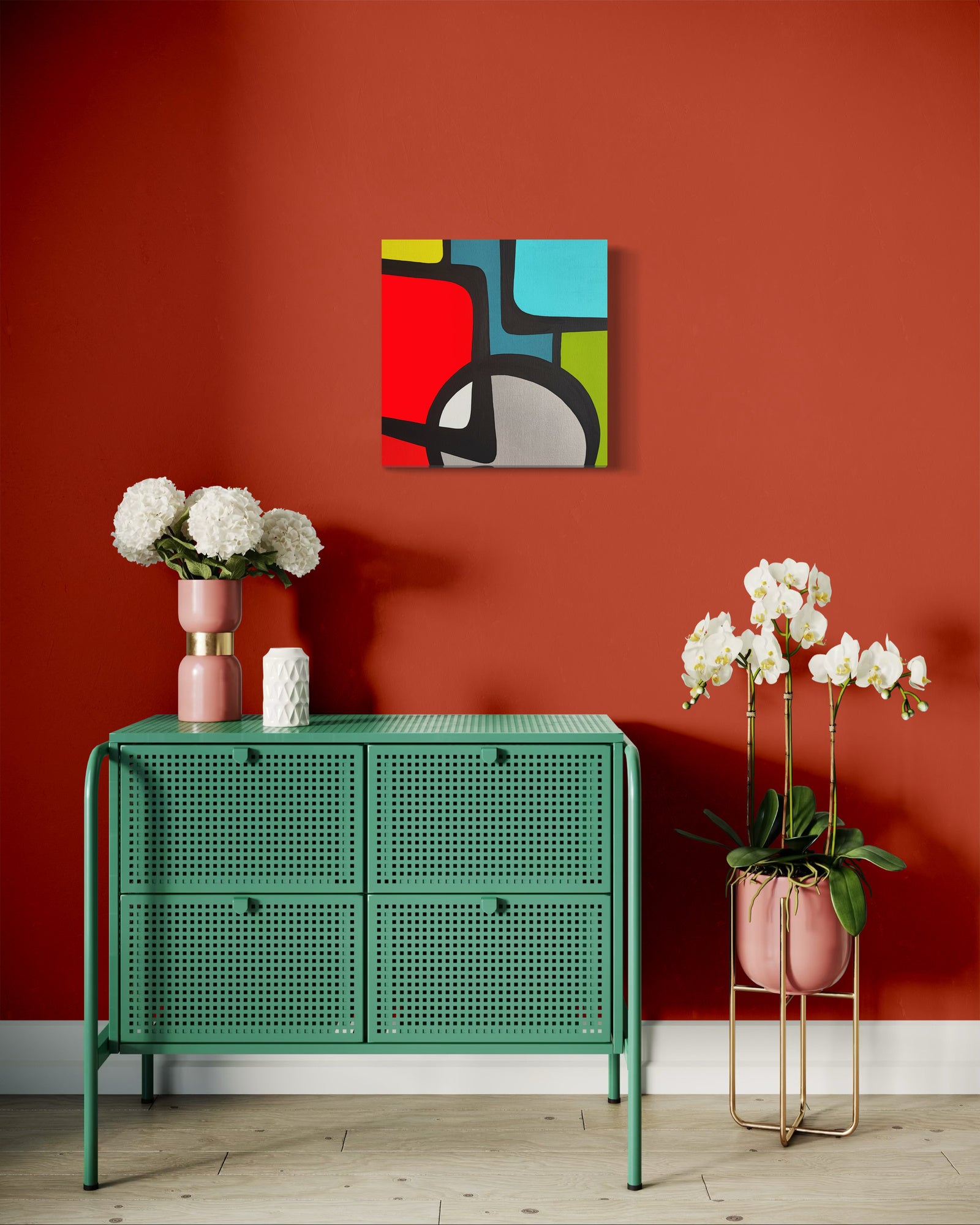 An abstract painting featuring bold blocks of color in red, yellow, turquoise, green, and gray. Thick black lines intersect the composition, creating a dynamic structure and contrast between the bright hues and neutral tones.
