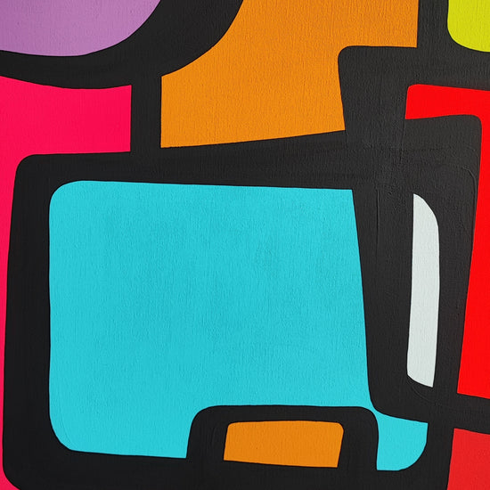 A dynamic abstract painting featuring vibrant geometric shapes in shades of turquoise, orange, red, and purple, outlined in striking black. The overlapping forms and clean lines give a sense of structure and modernity.
