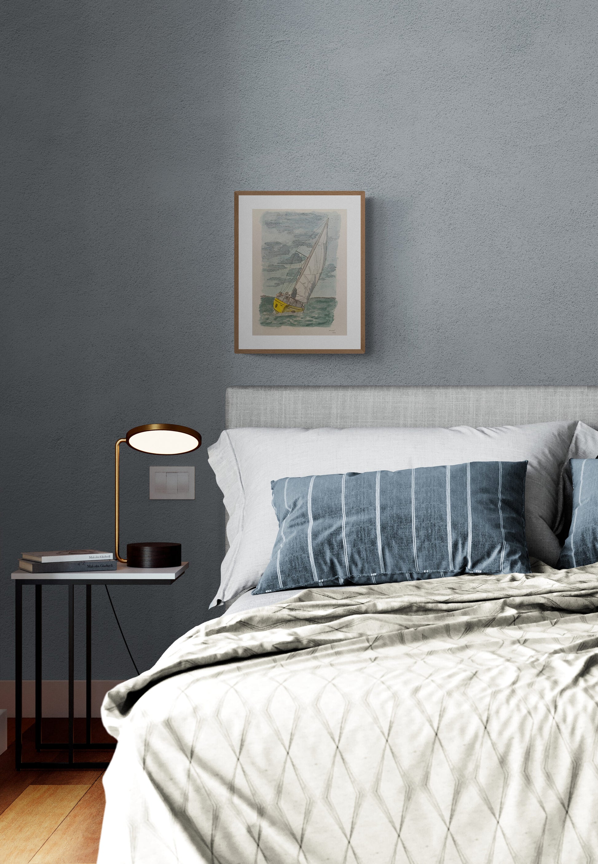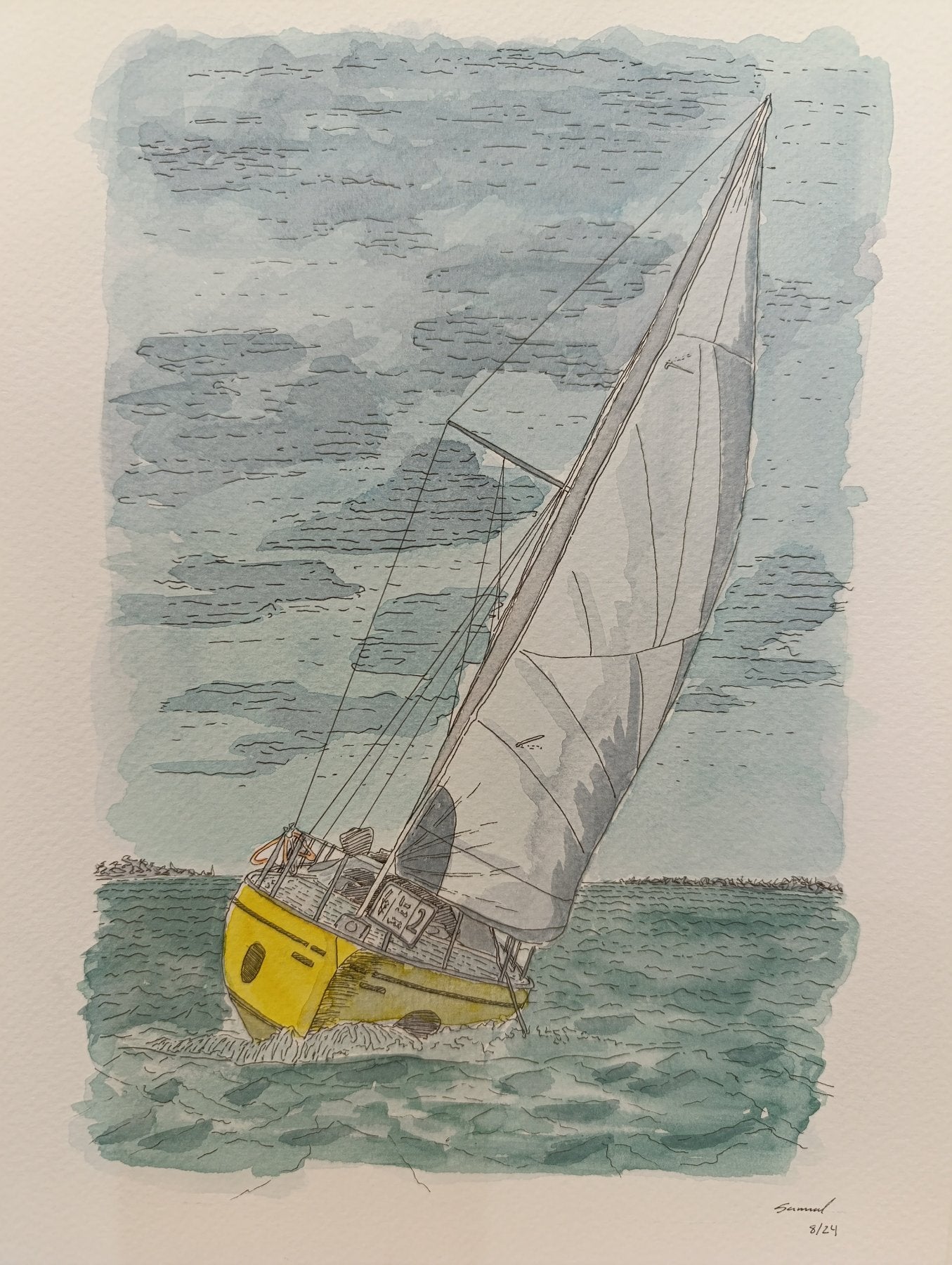 In this detailed watercolor and ink illustration, a yellow-hulled sailboat cuts through the water, its sails billowing as it leans gracefully into the wind. The movement of the waves and the tilt of the boat convey the dynamism of sailing, while the soft blue hues of the sea and sky offer a sense of serenity. The bright yellow hull stands out vividly against the subdued maritime tones, adding an element of modernity and contrast. This piece captures both the adventure and tranquility of sailing, making it perfect for maritime enthusiasts and art lovers alike.